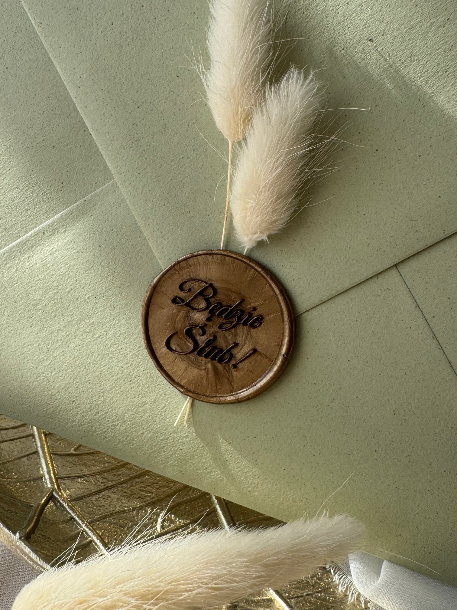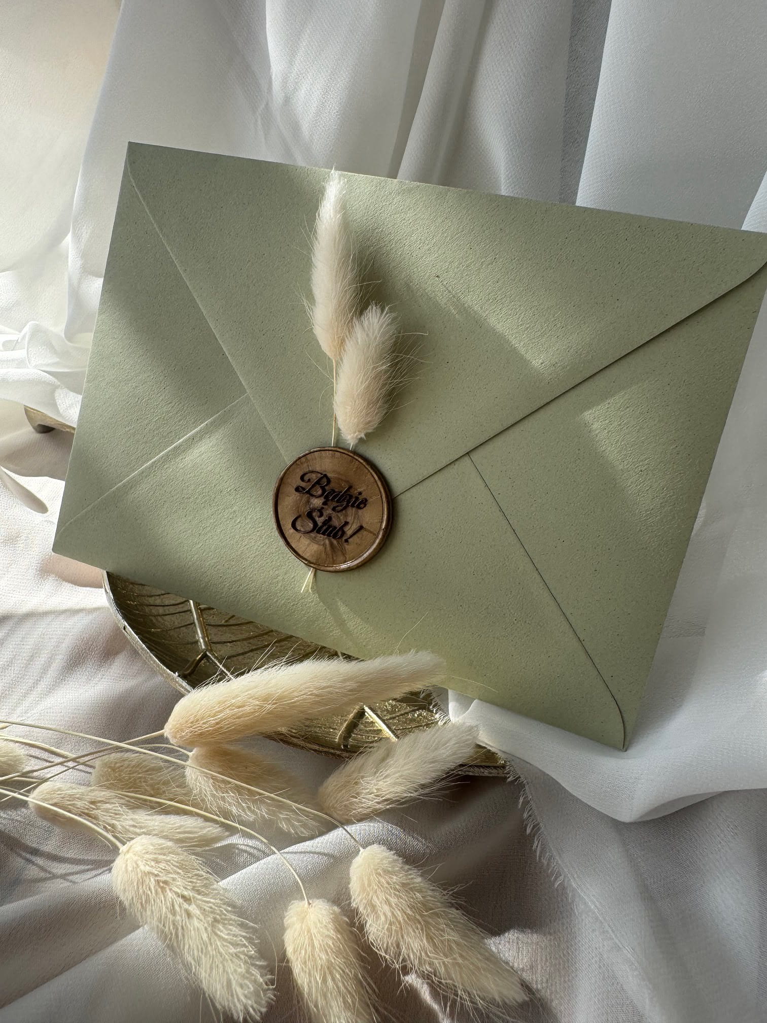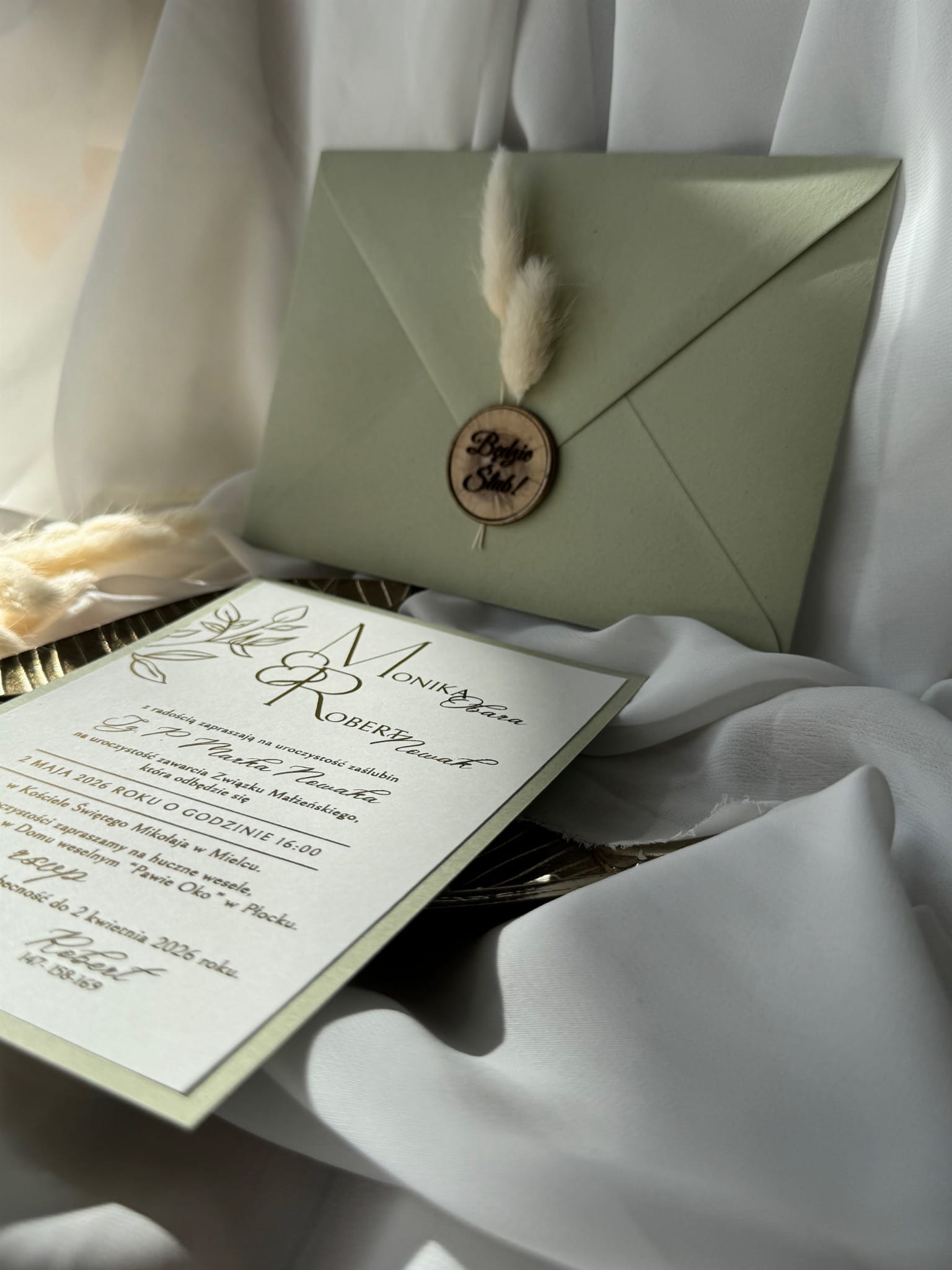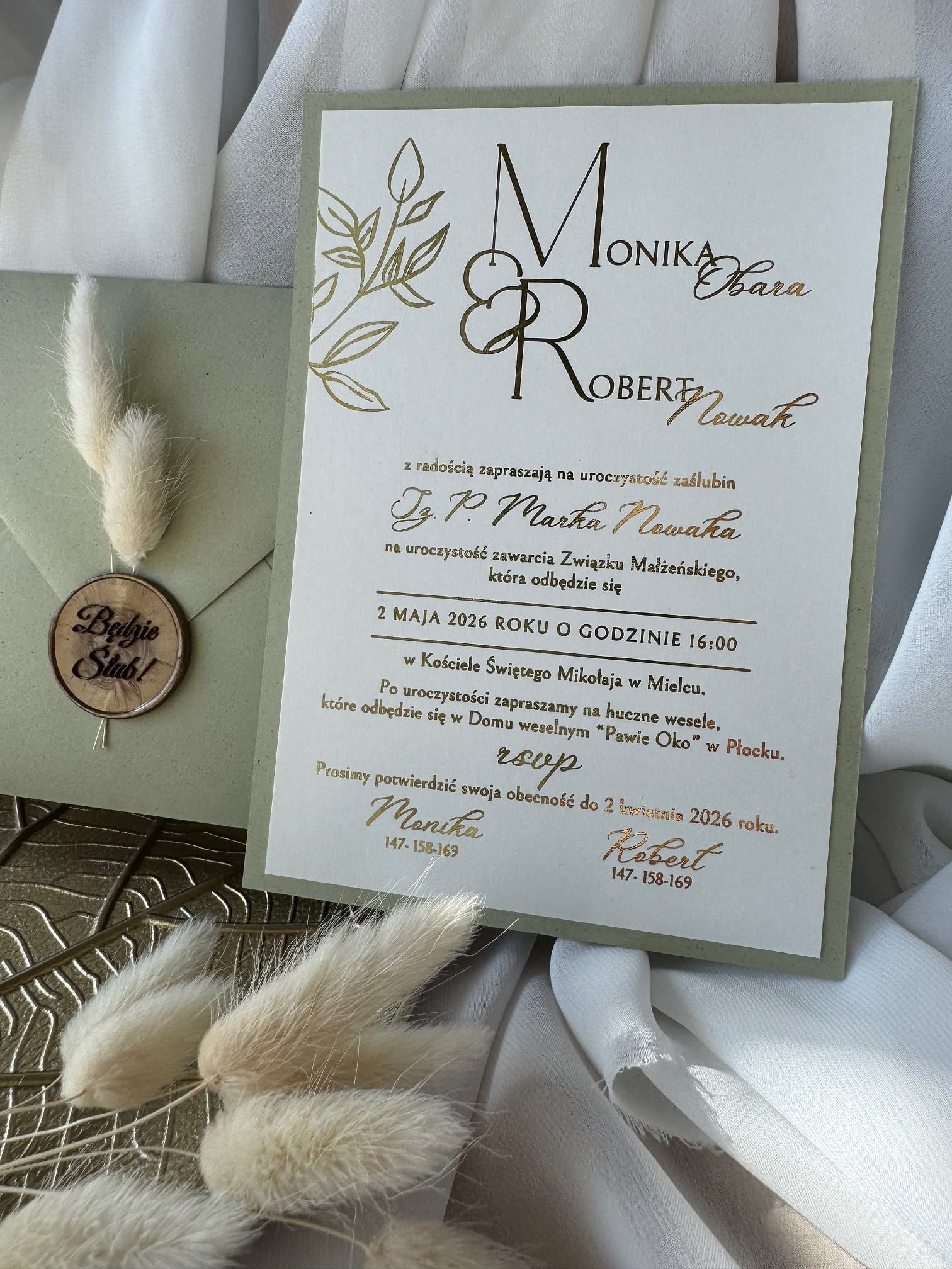 Zestaw obejmuje zaproszenie, szałwiową kopertę 220 g/m², wkładkę RSVP oraz lak dekoracyjny z napisem „Będzie Ślub”. Dzięki temu całość prezentuje się spójnie i wyjątkowo.