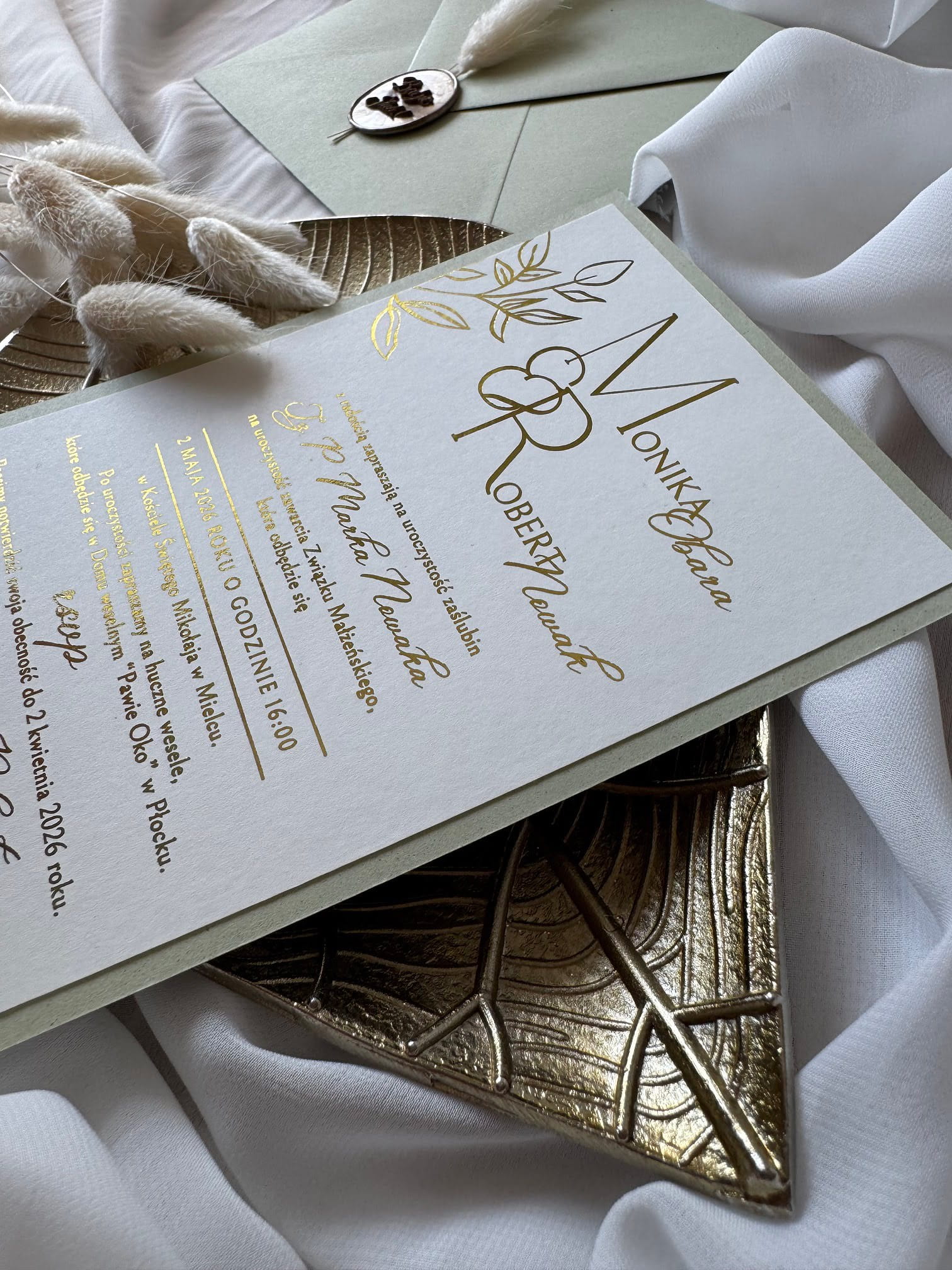 Zaproszenie ślubne „Auric” to połączenie natury i luksusu. Subtelny motyw roślinny w złoceniu pięknie komponuje się z ecru i szałwiową kopertą. To idealna propozycja dla par, które cenią elegancję, spójną estetykę i wysoką jakość wykonania.