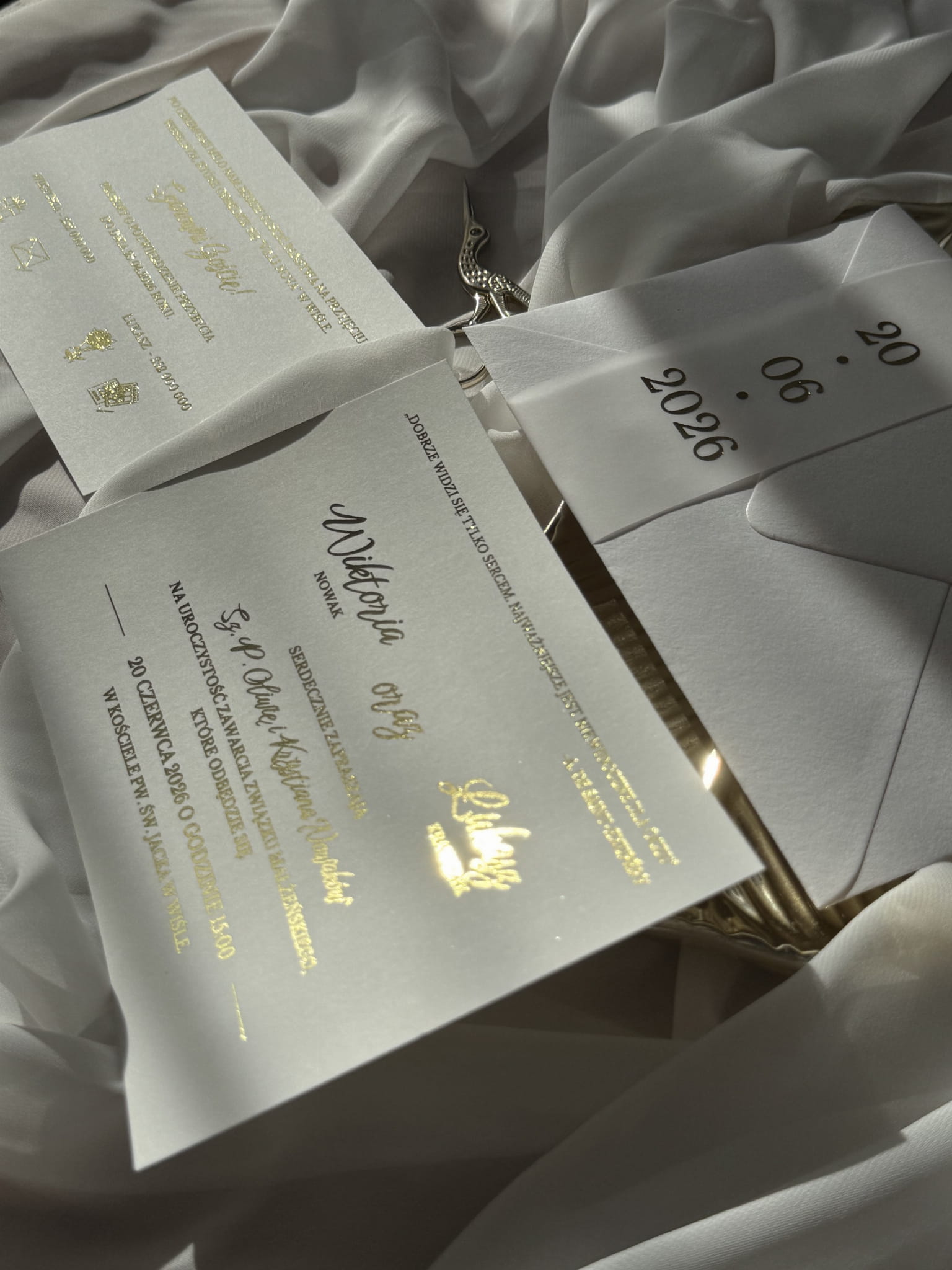 Zaproszenie „Golden Grace” wykonane jest z kremowego papieru premium 250 g, który nadaje całości delikatności i klasy. Minimalistyczny projekt z wyrafinowanymi zdobieniami doskonale podkreśla uroczysty charakter wydarzenia.