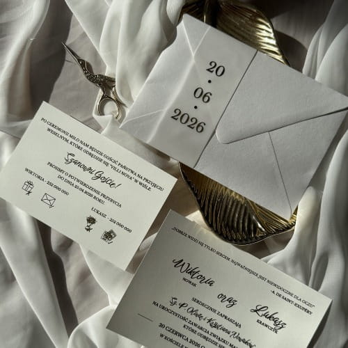 W skład kompletu wchodzi zaproszenie, elegancka koperta, dekoracyjna opaska oraz wkładka RSVP. Dzięki temu całość prezentuje się spójnie i wyjątkowo.