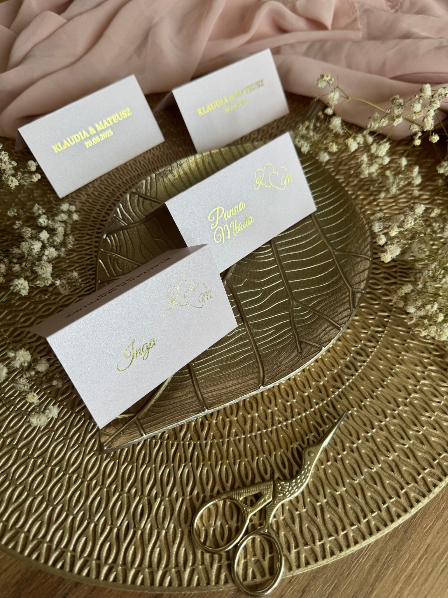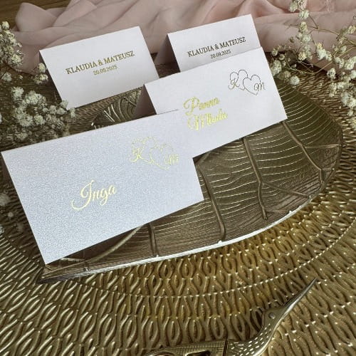Subtelne winietki ślubne w różowym kolorze z luksusowym złotym nadrukiem sprawiają, że każdy gość poczuje się wyjątkowo. Detal ten pięknie komponuje się z aranżacją stołu w stylu glamour, romantycznym lub nowoczesnym.