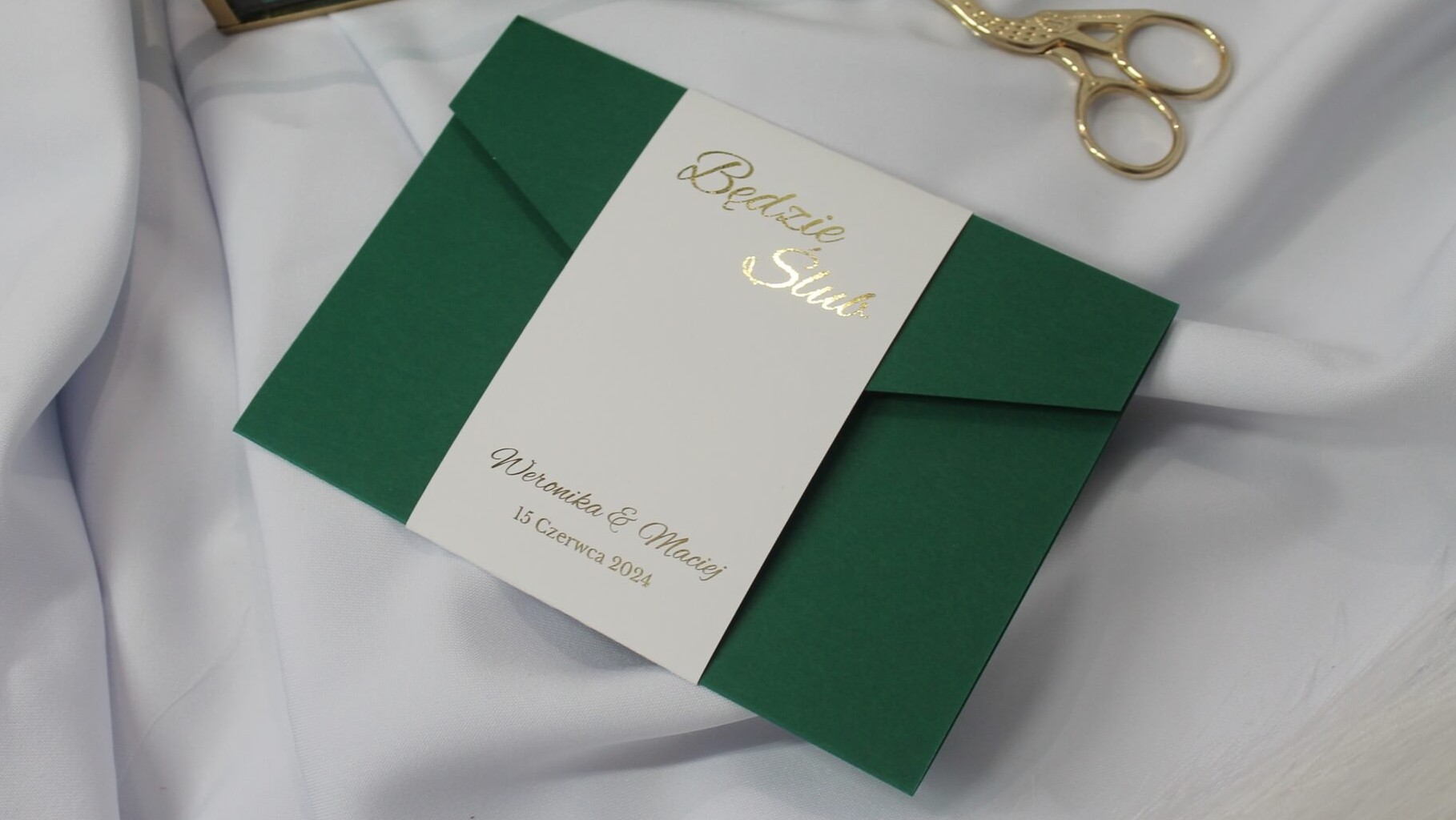 Poradnik dla przyszłych par młodych – dowiedz się, jak poprawnie i elegancko wypisać zaproszenia ślubne. Praktyczne wskazówki, przykładowa treść oraz inspiracja do stylowych zaproszeń folderowych w butelkowej zieleni.