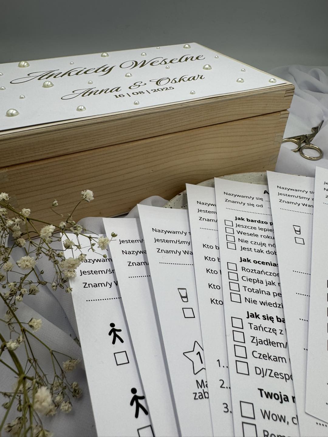 Stwórz wyjątkową atmosferę podczas przyjęcia weselnego dzięki ankietom weselnym w eleganckim drewnianym pudełku z perełkami. To nie tylko piękny element dekoracyjny, ale także świetna atrakcja dla gości i wzruszająca pamiątka na lata.