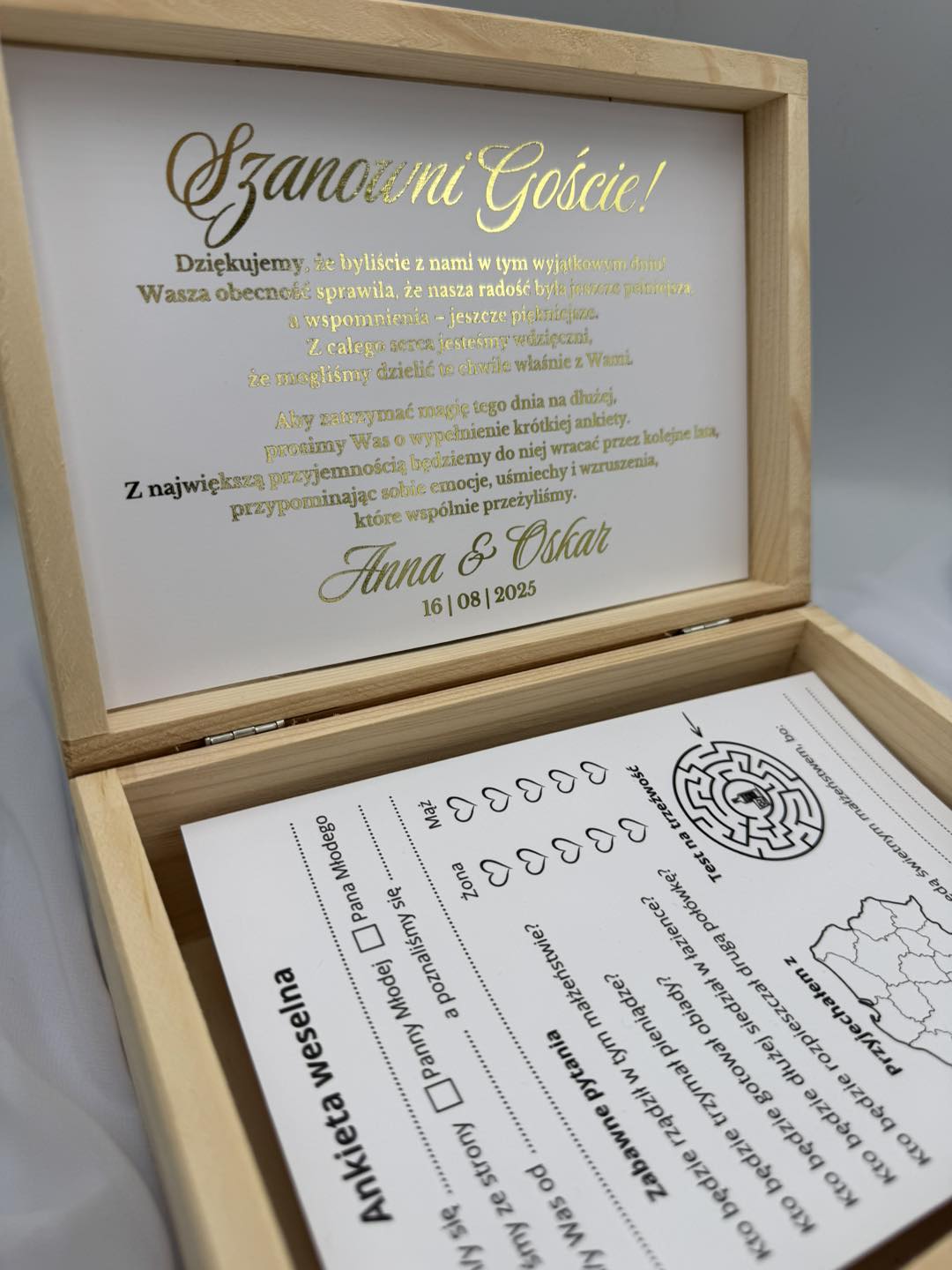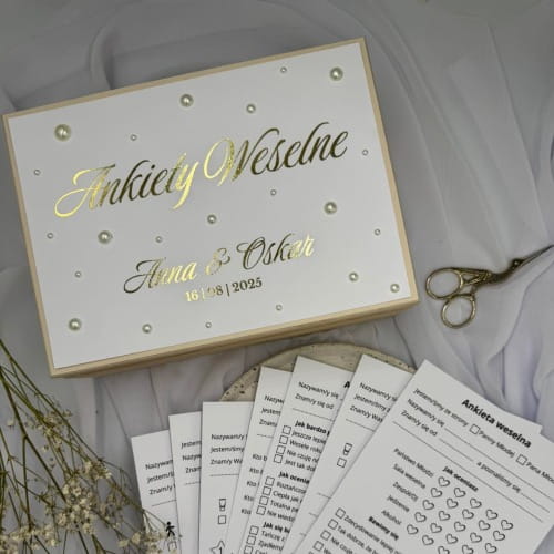 Ankiety weselne w drewnianym pudełku z perełkami. Personalizowane pudełko z imionami i datą ślubu, złocony napis, 50 ankiet na papierze 250 g/m². Możliwość wyboru 3 z 8 wariantów. Czas realizacji: 10–14 dni, express 5–7 dni.