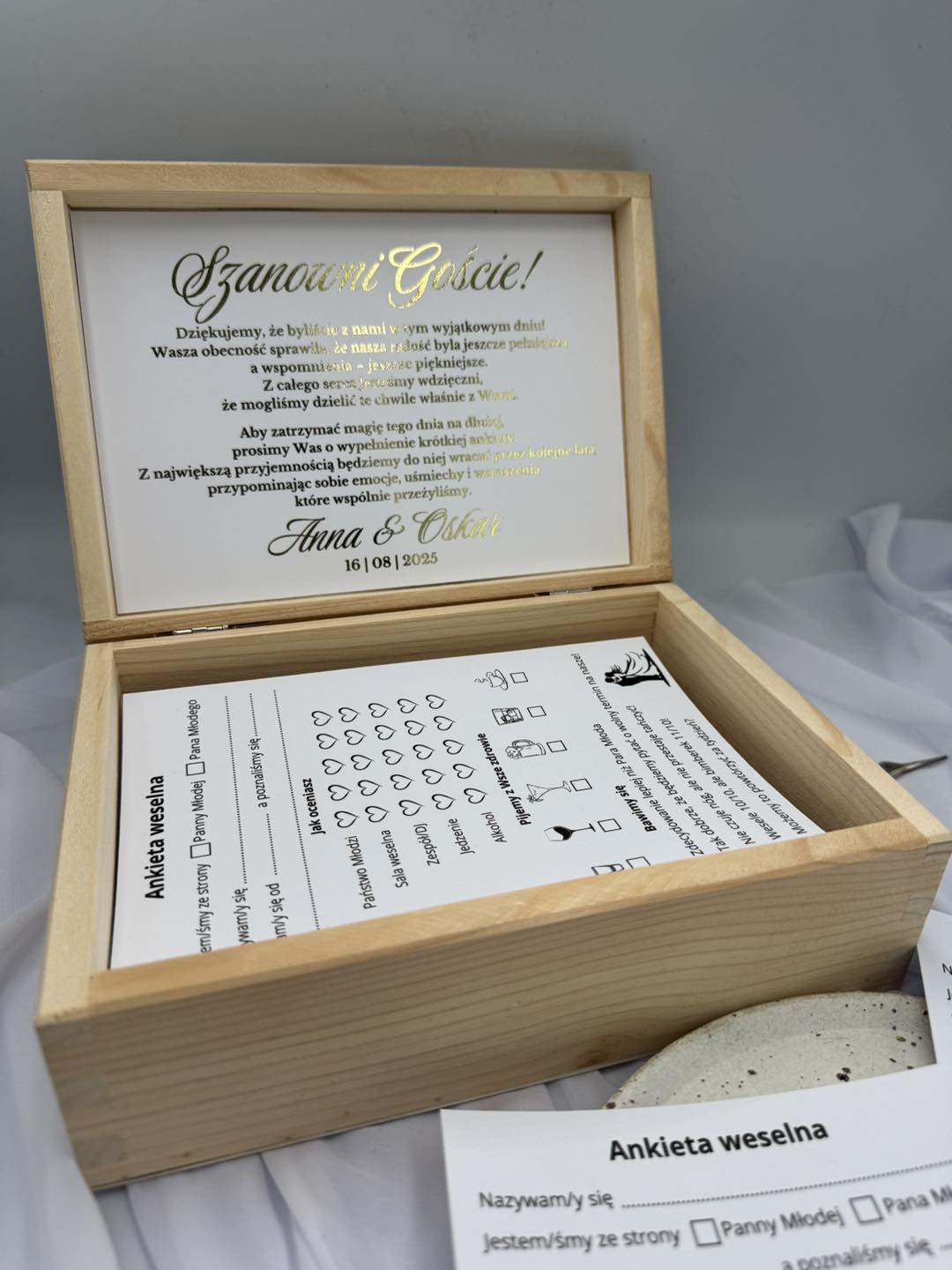 - ✔ Drewniane pudełko z personalizacją (imiona, data ślubu)