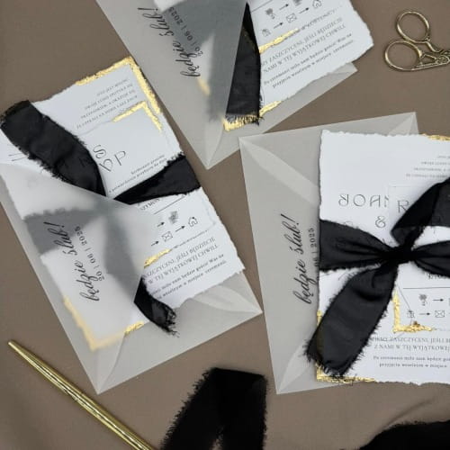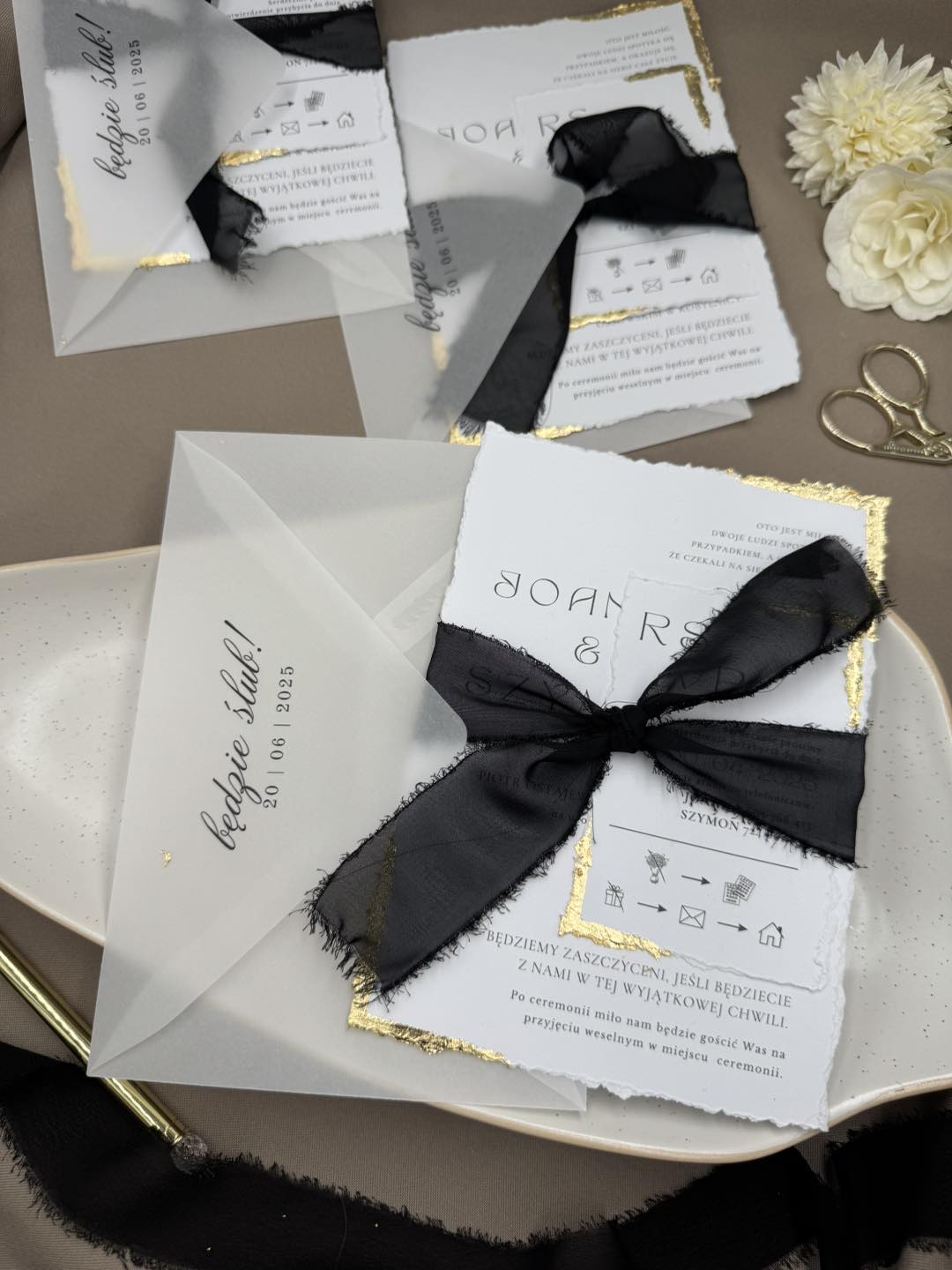 Zaproszenia wykonane są z papieru premium o wysokiej gramaturze, z eleganckimi ręcznymi złoceniami oraz delikatnie rwanymi brzegami. Czarna szyfonowa wstążka nadaje im charakteru glamour i ponadczasowej klasy.