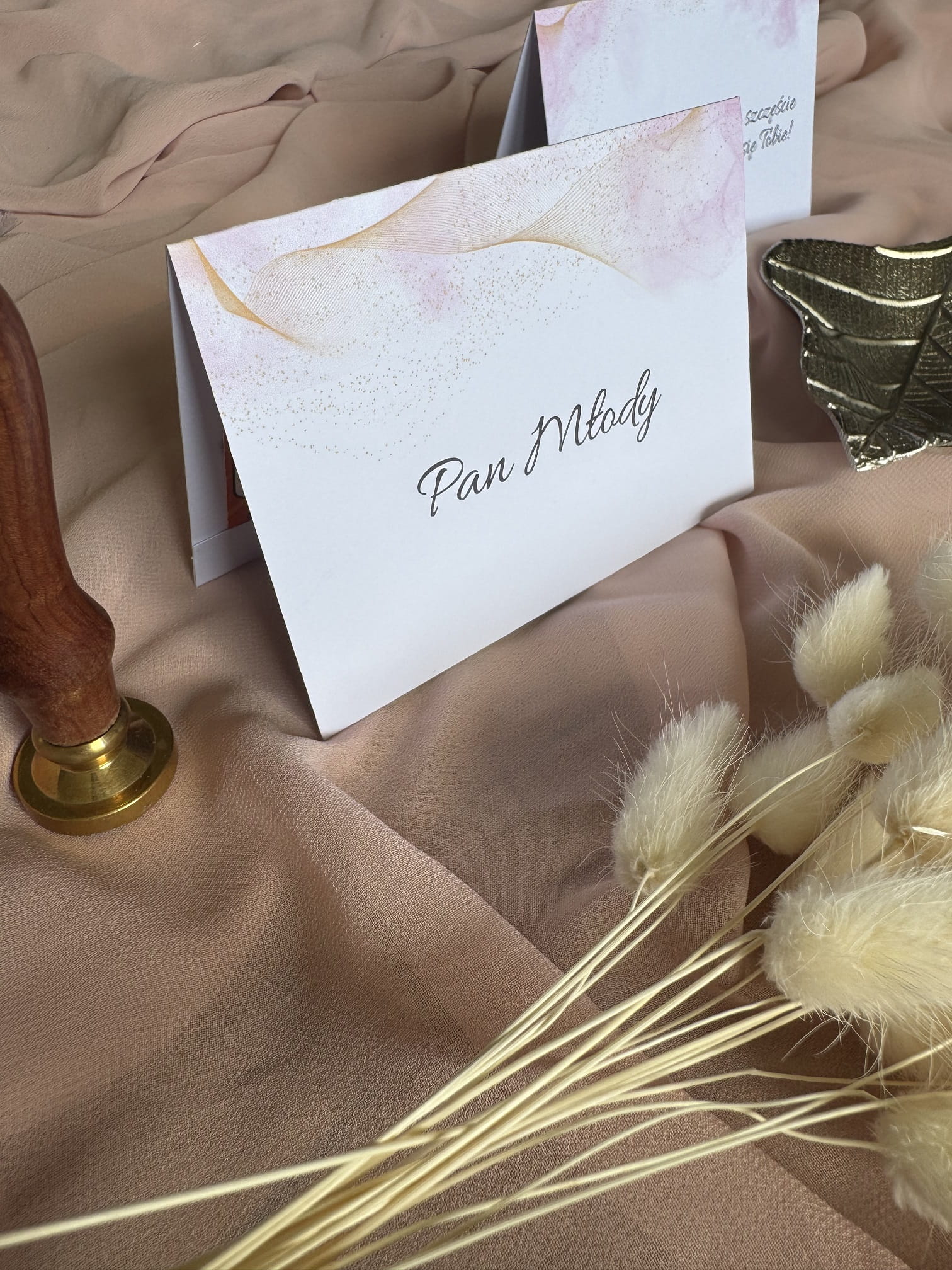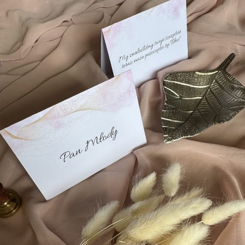 Każda winietka wykonana jest z papieru premium o gramaturze 250 g/m² i zdobiona subtelnym wzorem. Imiona i nazwiska gości nanoszone są indywidualnie, co nadaje projektowi elegancki i personalizowany charakter. To doskonałe połączenie praktycznego oznaczenia miejsc z nietypową formą podziękowania.