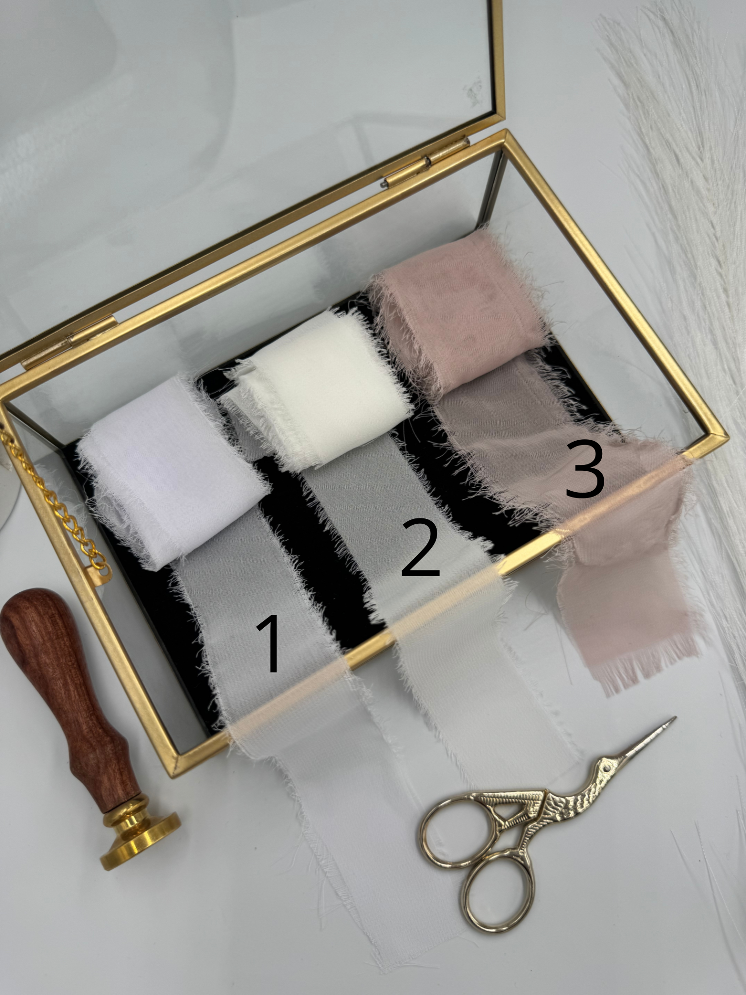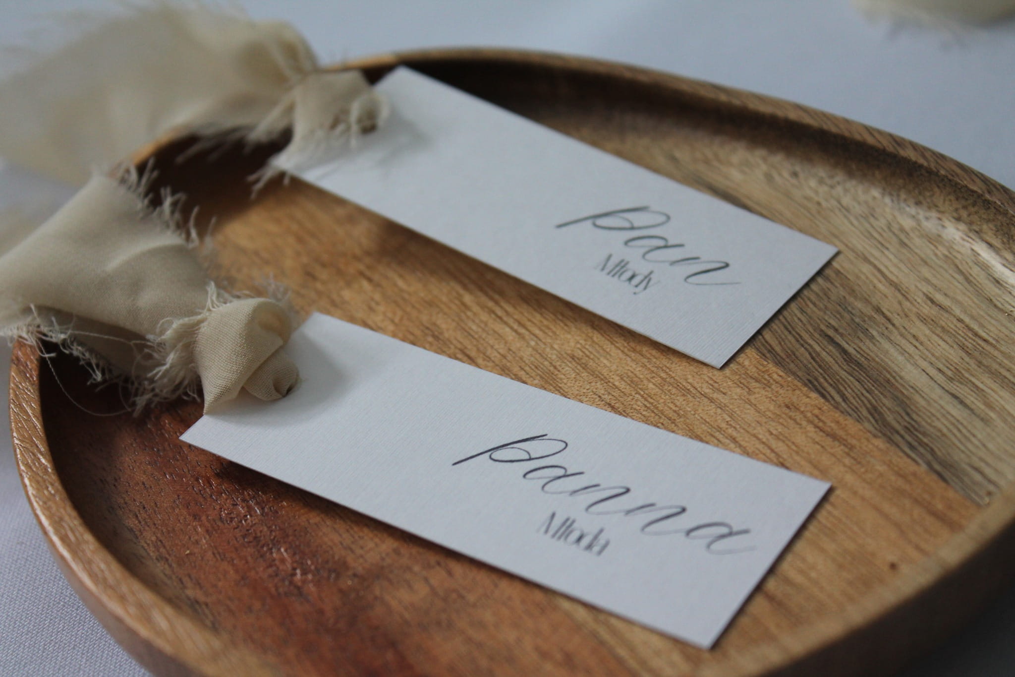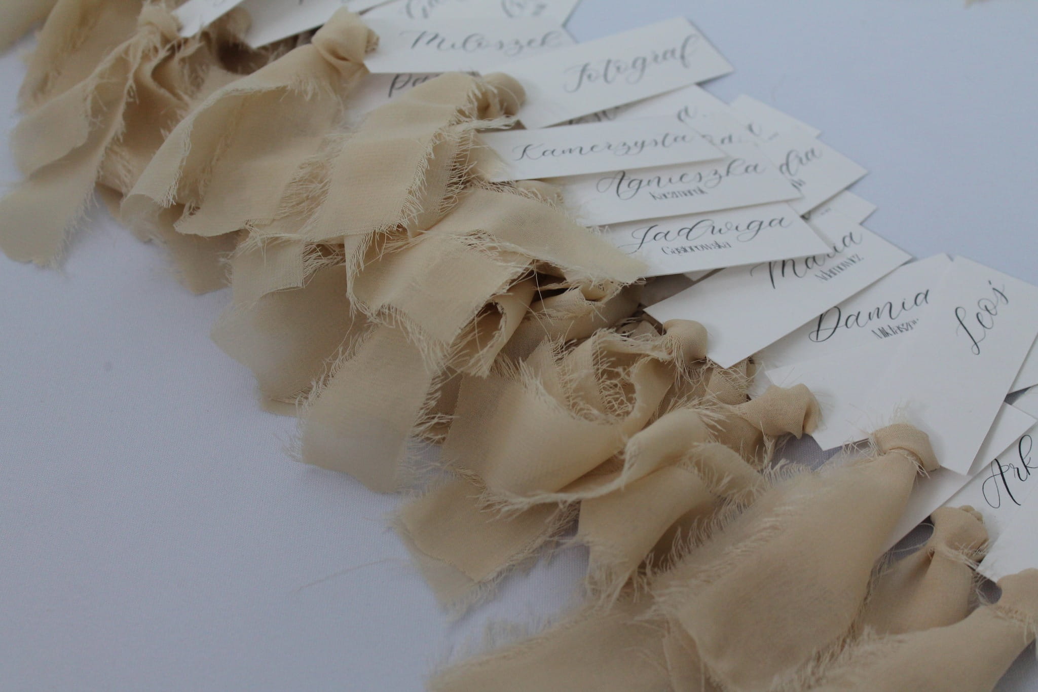 Winietki wykonane są z białego, gładkiego papieru 240 g/m², który zapewnia elegancję i trwałość. Każda z nich zdobiona jest szyfonową wstążką, nadającą im delikatności i romantycznego uroku.