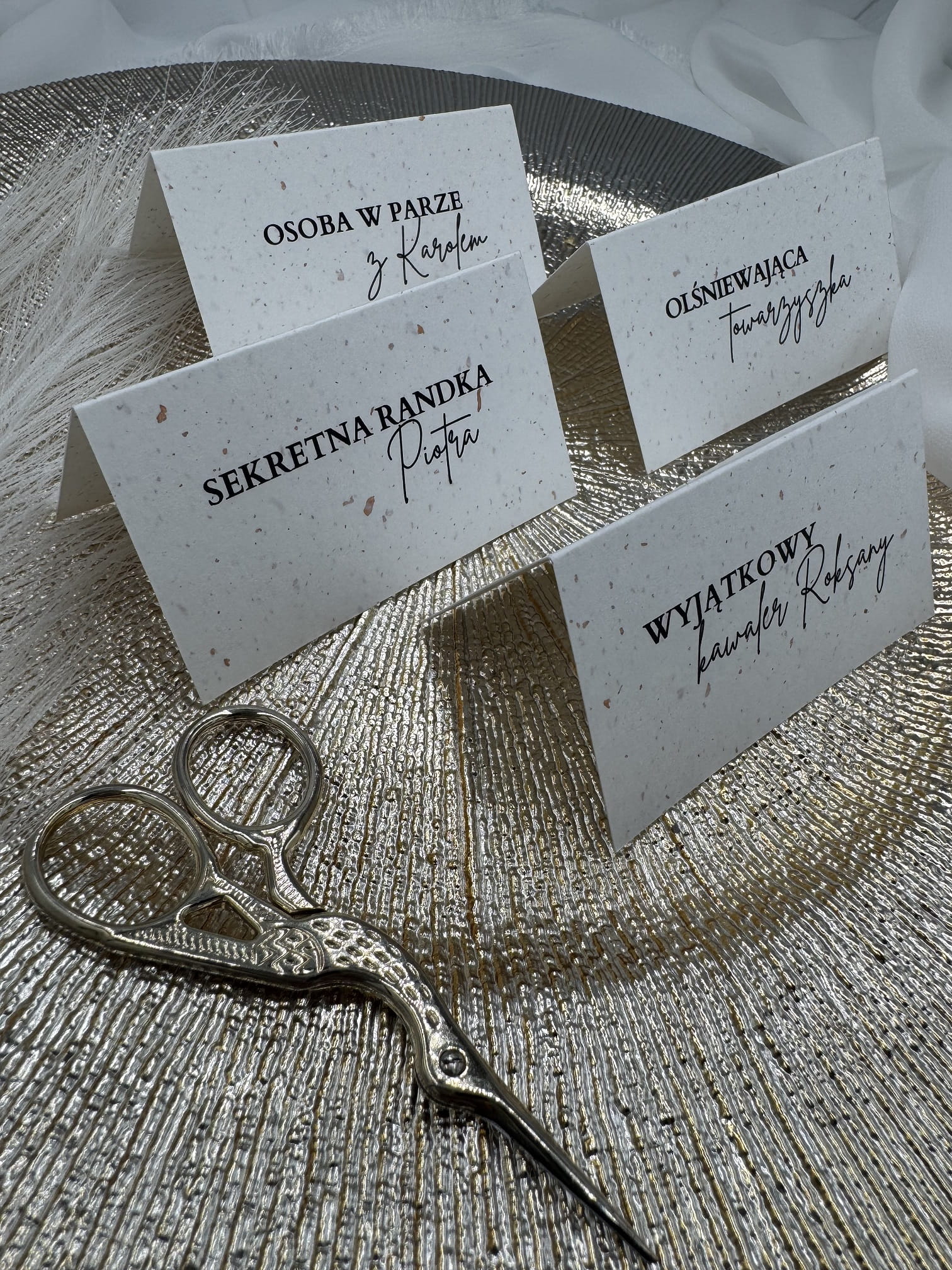 Eleganckie winietki ślubne składane – biały papier 230 g, format 9 × 5 cm. Personalizowane imionami i nazwiskami gości. Minimalne zamówienie: 20 sztuk. Realizacja: 10–14 dni, express 5–7 dni. Darmowa dostawa od 500 zł.
