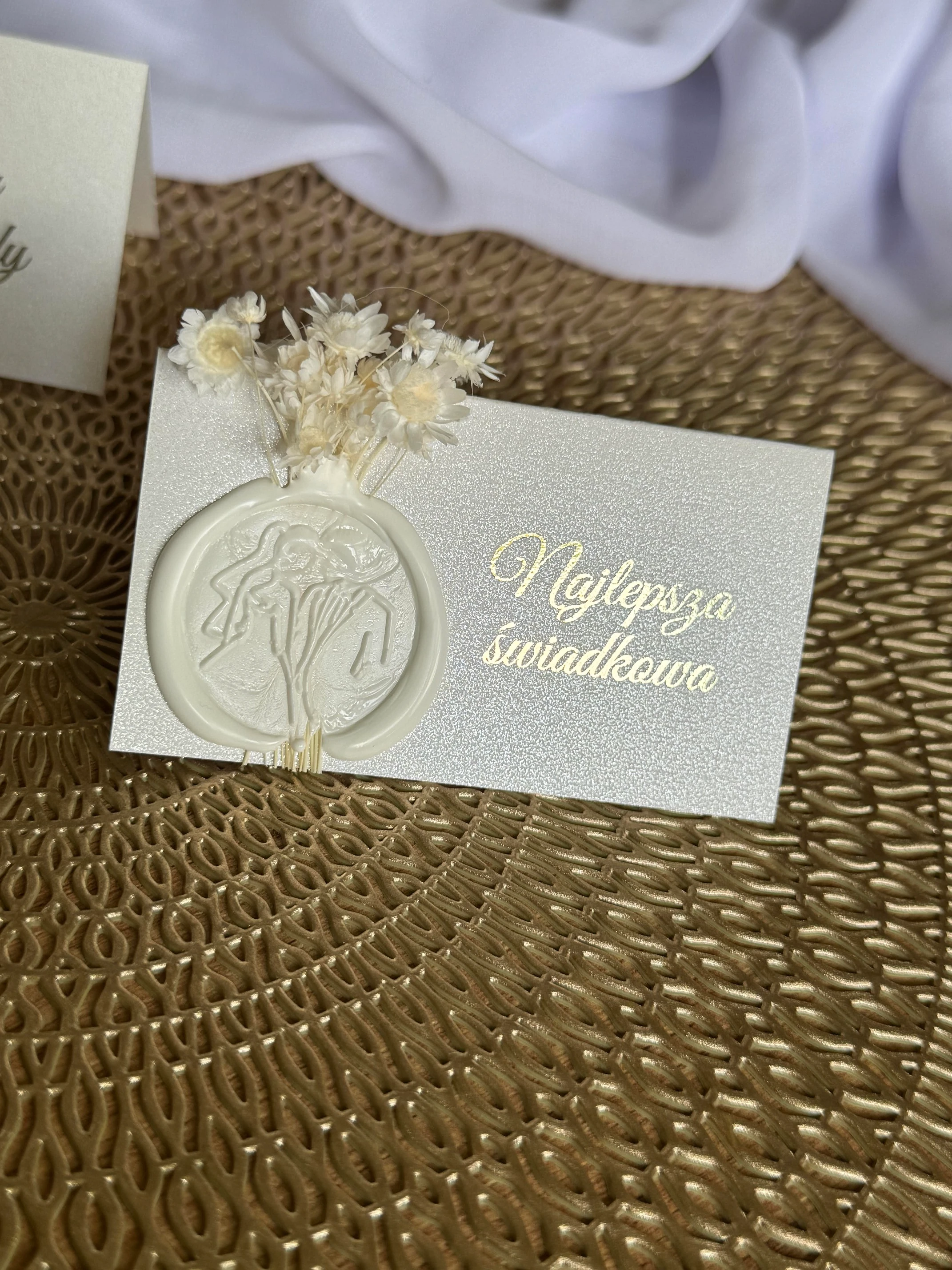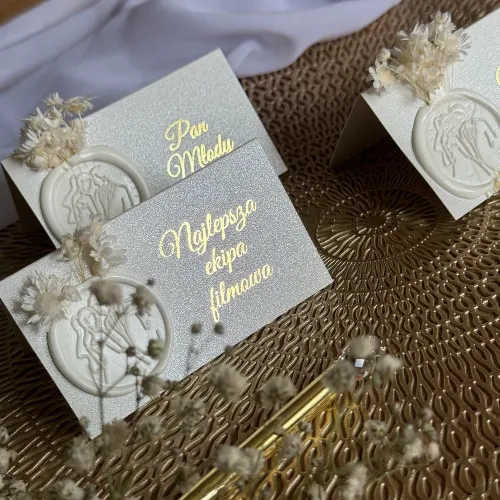 Winietki ślubne z suszonymi kwiatami i woskowym stemplem. Materiał: papier perłowy. Minimalne zamówienie: 20 szt. Czas realizacji: standard 10–14 dni, ekspres 5–7 dni.