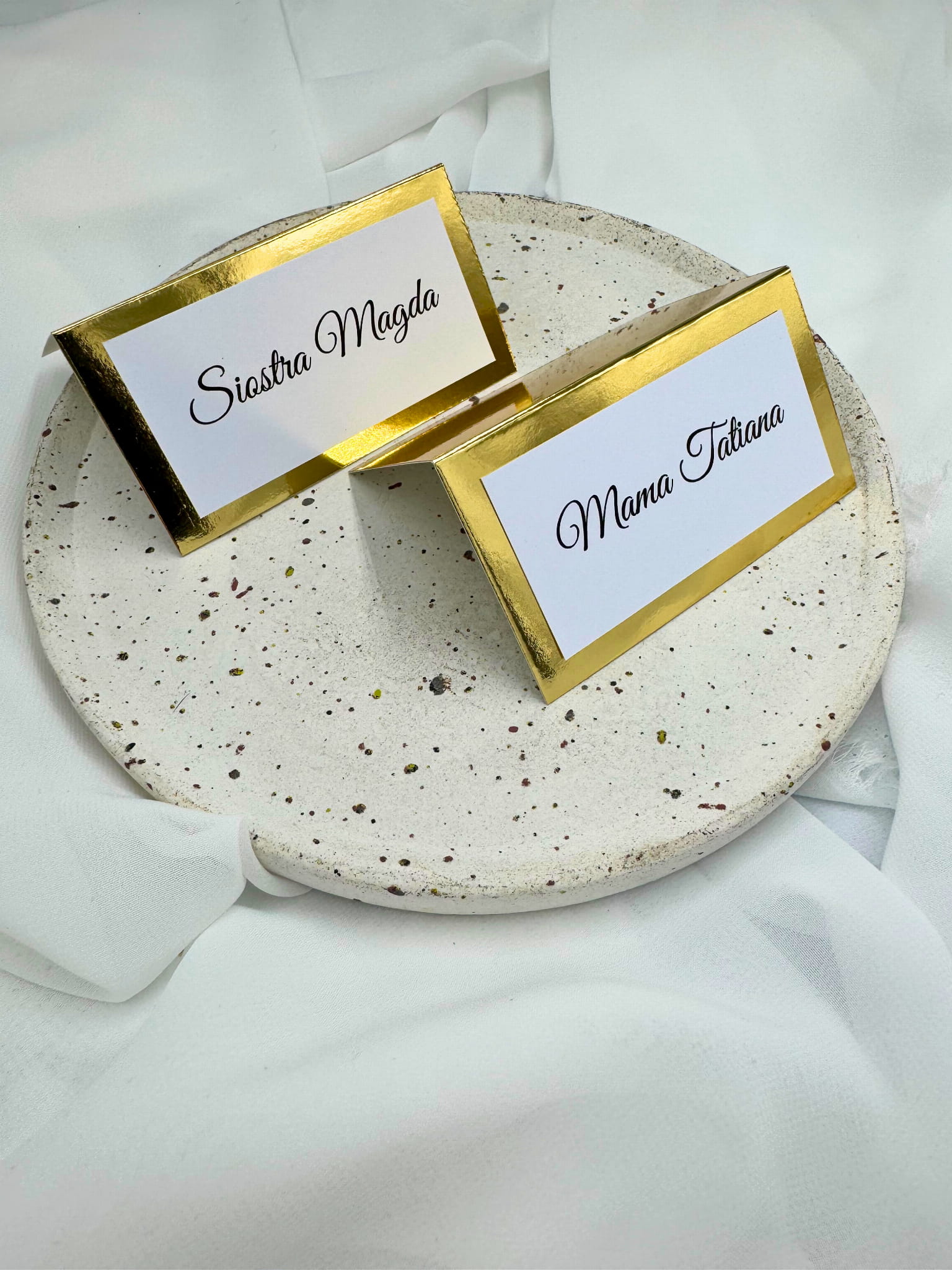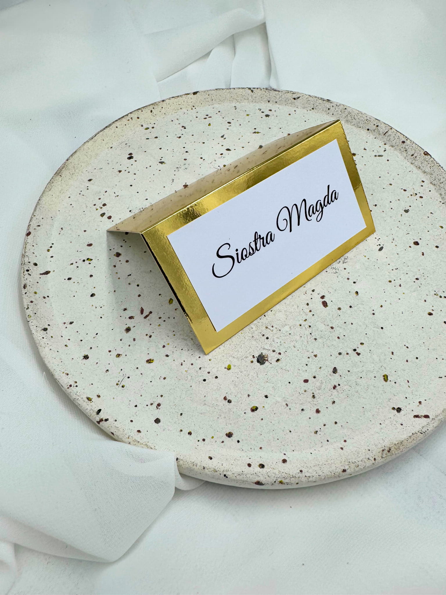 Winietki ślubne ze złotą ramką, papier 225 g/m², składane, stojące, personalizowane imionami gości. Minimalne zamówienie: 20 sztuk. Czas realizacji: 10–14 dni roboczych, express 5–7 dni. Projekt wysyłany do akceptacji (24h).