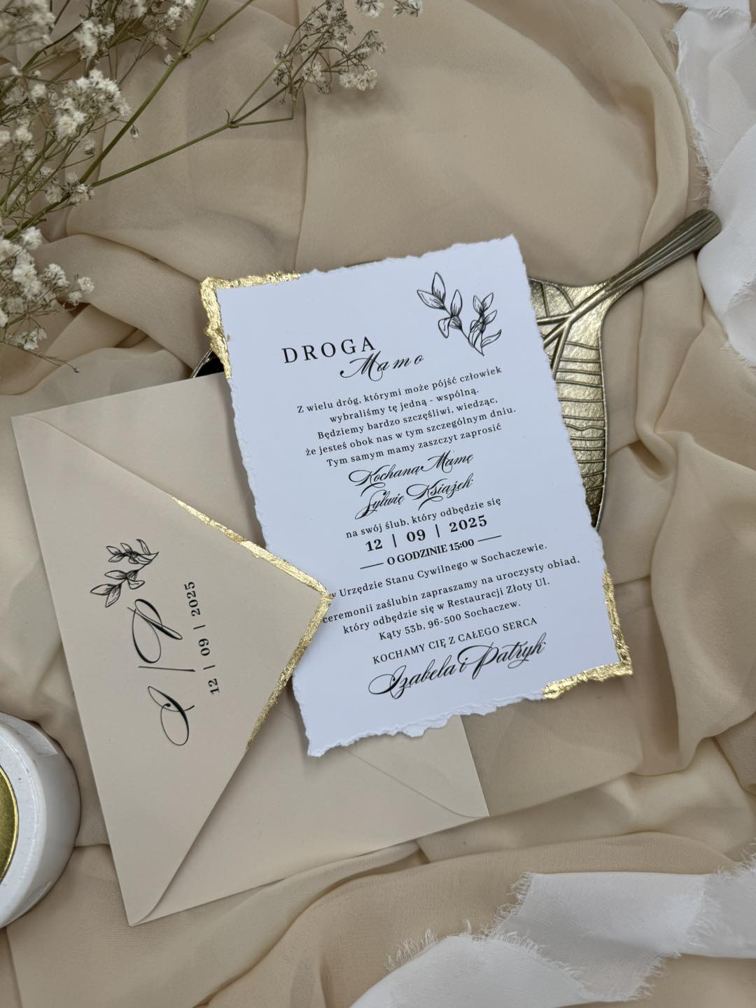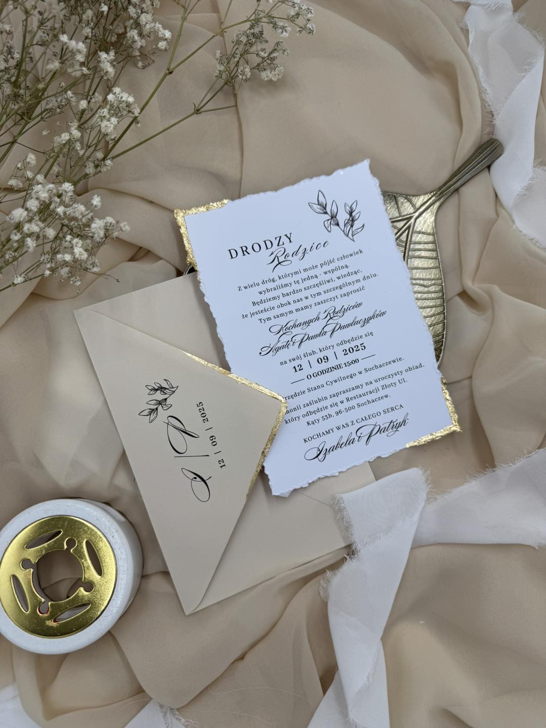 Zaproszenie w formacie B6 (12 × 17 cm) zostało ozdobione ręcznymi złoceniami, które nadają mu blasku i elegancji. Rwane brzegi papieru podkreślają artystyczny charakter, a beżowa wstążka i dopasowana koperta sprawiają, że całość wygląda harmonijnie.