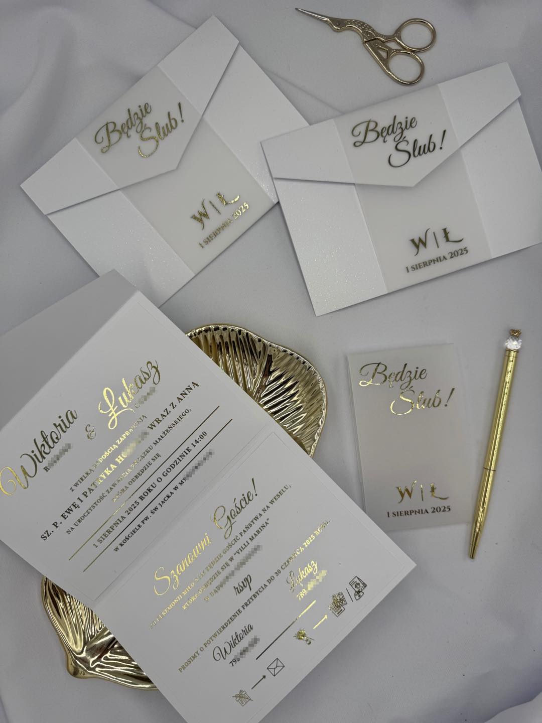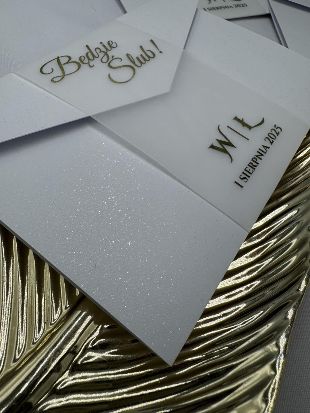 - W zestawie: zaproszenie + opaska z kalki ze złoceniem