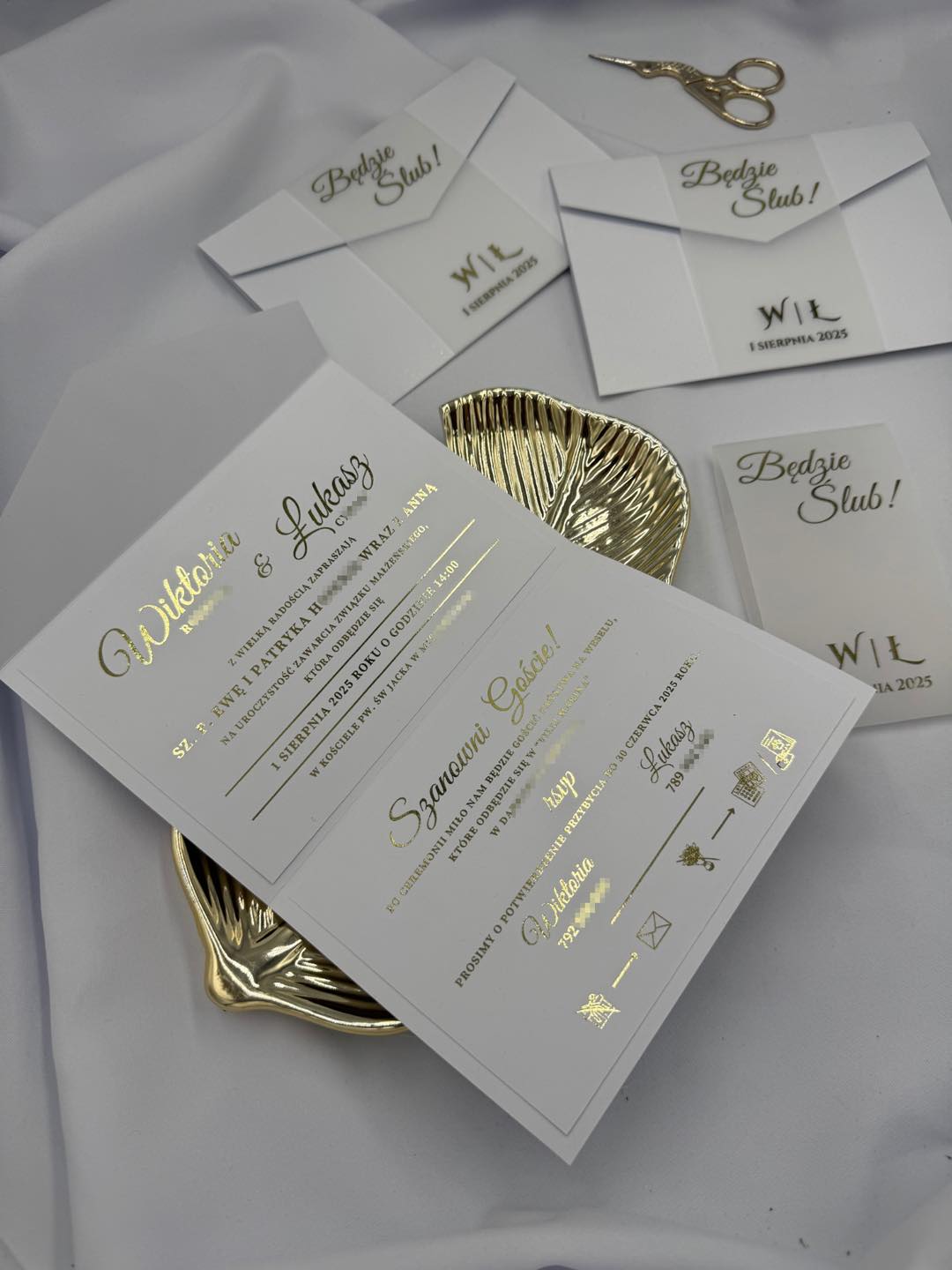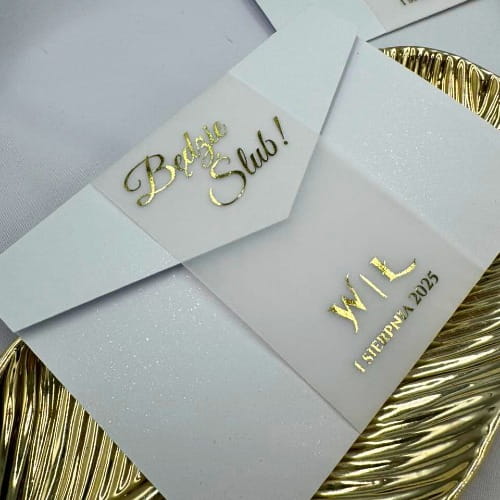Każde zaproszenie zdobi opaska z półtransparentnej kalki oraz eleganckie złocenia wykonane metodą hot-stampingu. To detale, które sprawiają, że całość prezentuje się luksusowo i z klasą.