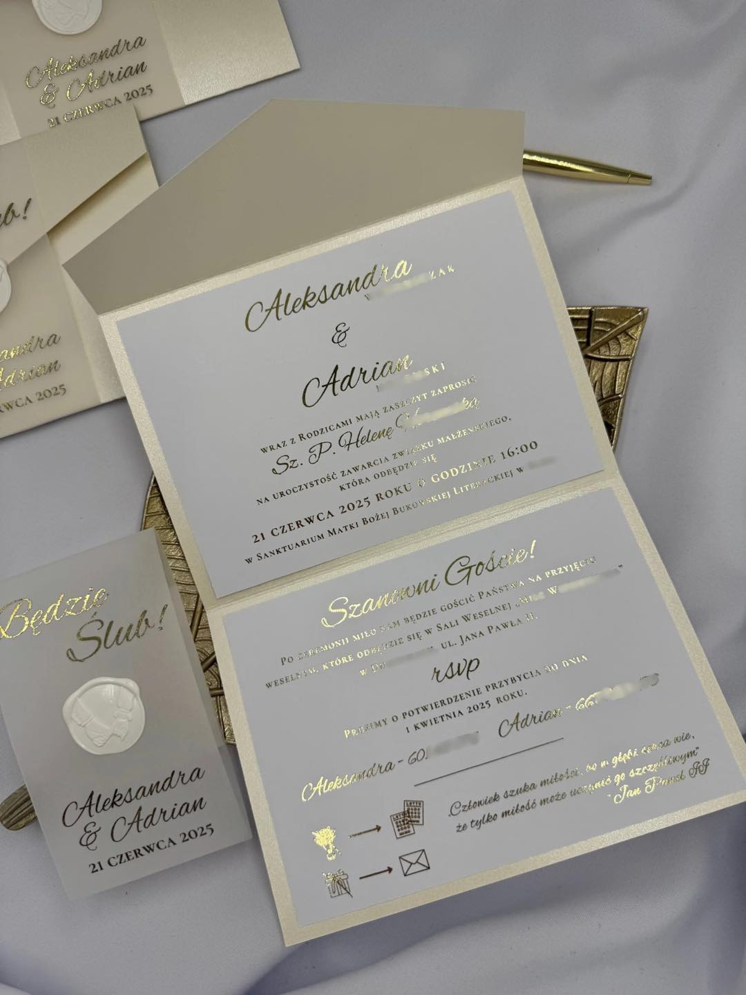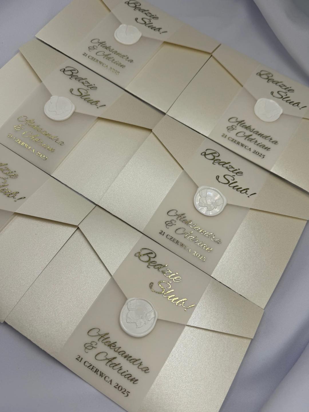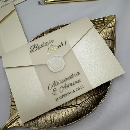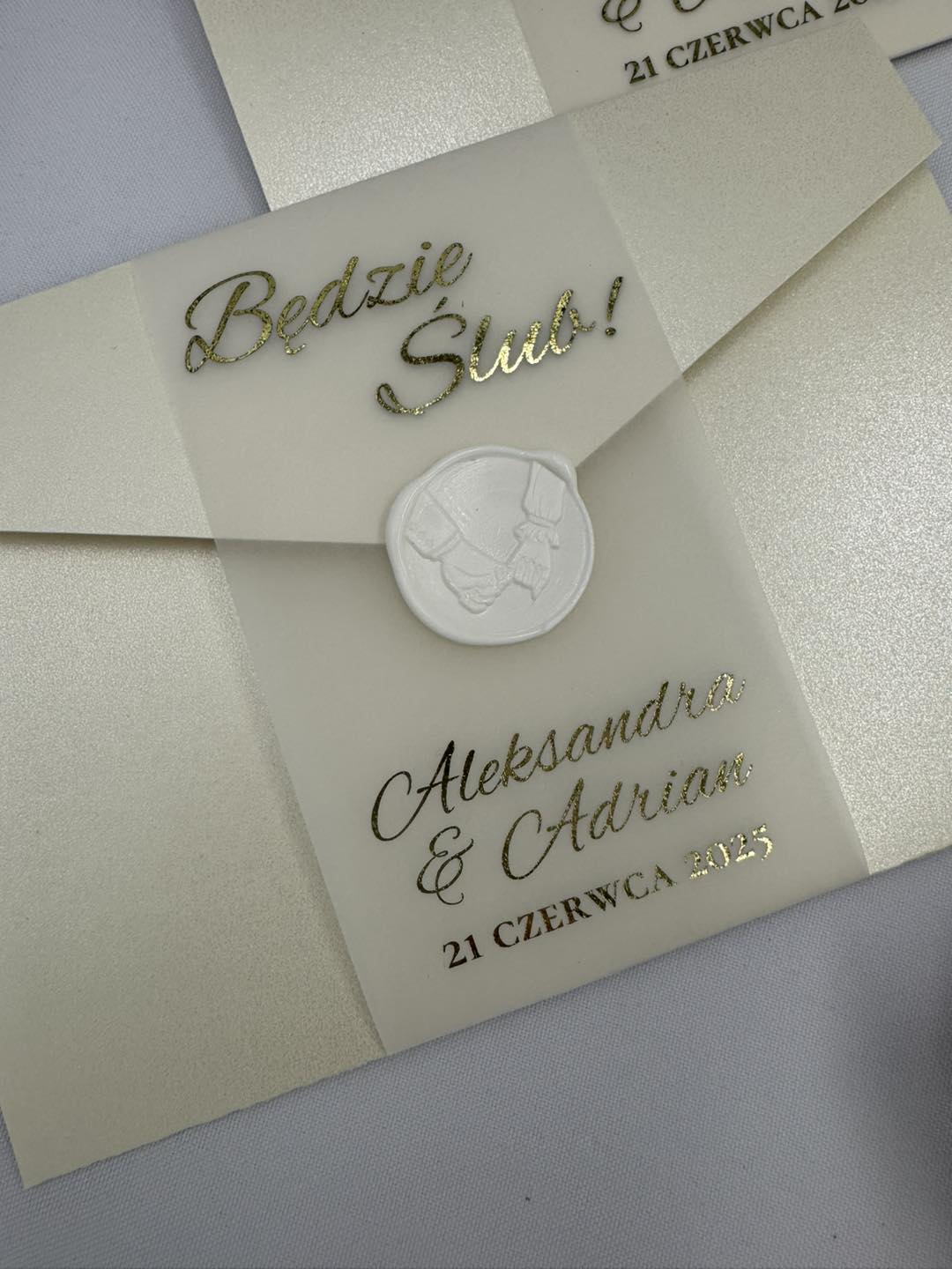 - W zestawie: zaproszenie + opaska z kalki ze złoceniem + odbicie lakowe w kolorze białym