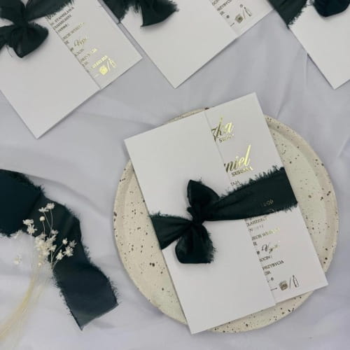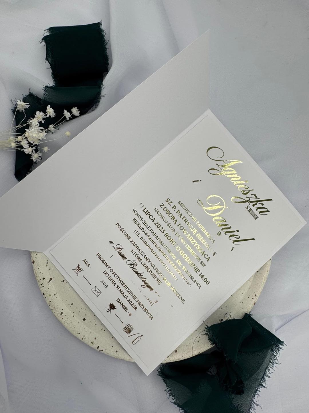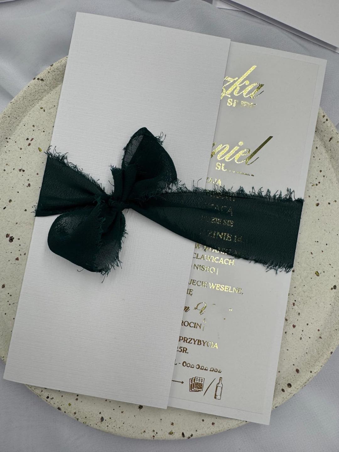 Zaproszenia wykonane są w formacie B6 (12,5 × 17,5 cm), na papierze w kolorze śnieżnej bieli. Zdobienia powstały metodą hot-stampingu, dzięki czemu złote napisy pięknie połyskują. Szyfonowa wstążka w kolorze butelkowej zieleni dodaje szyku, a jej barwę możesz dopasować do stylu swojego wesela.