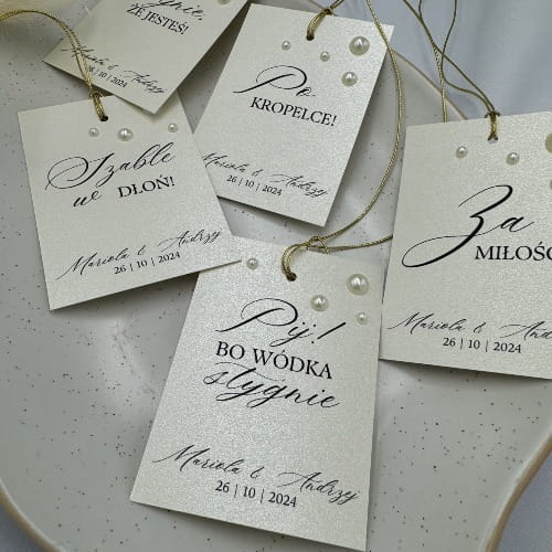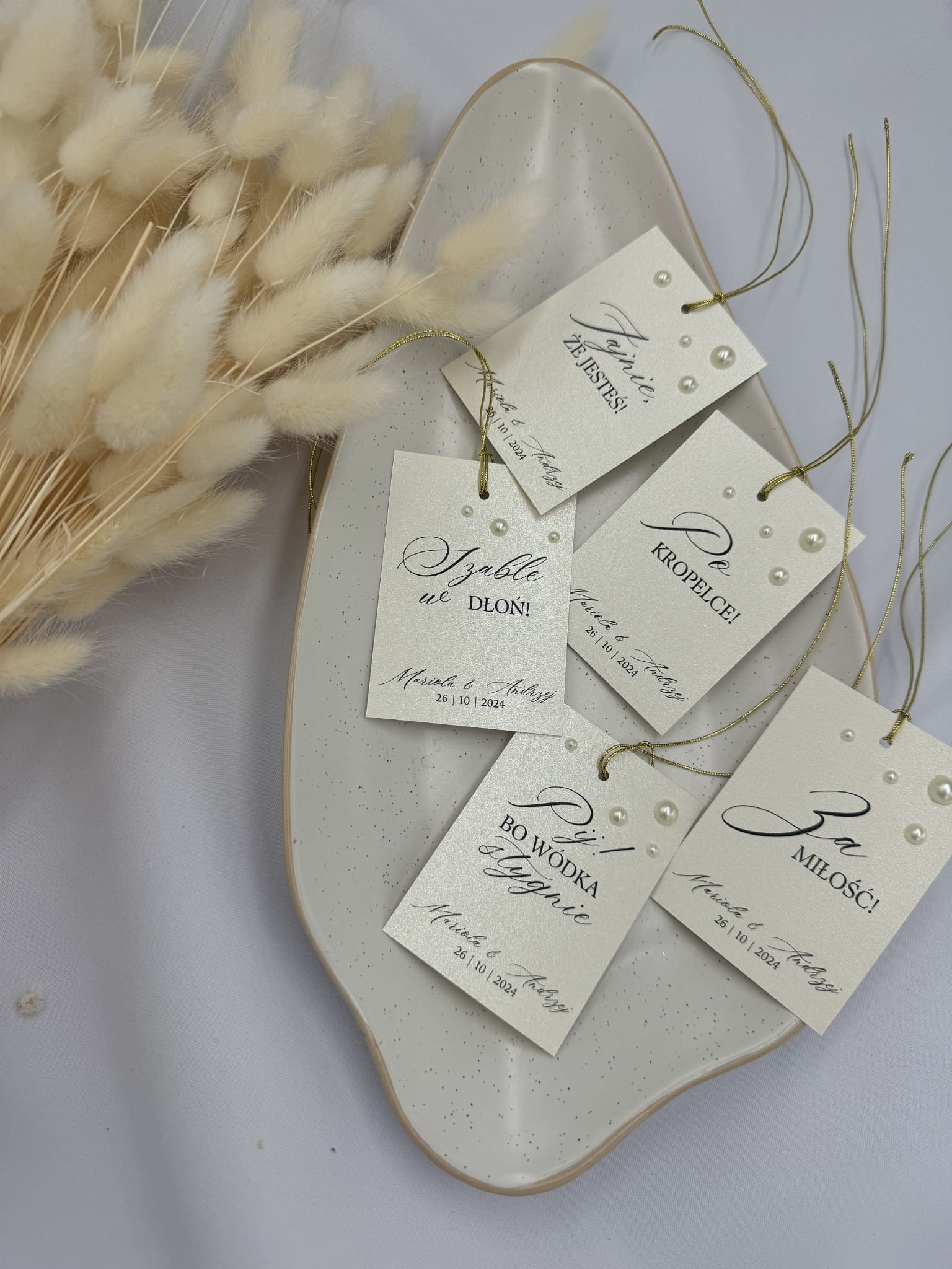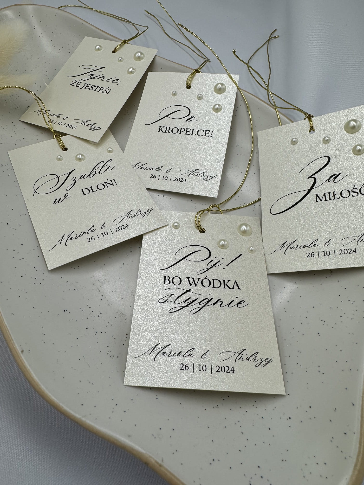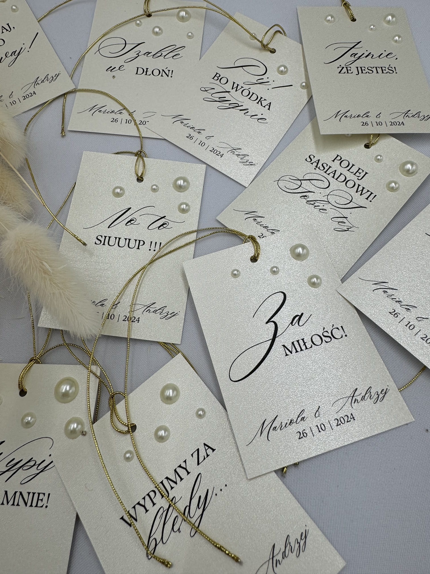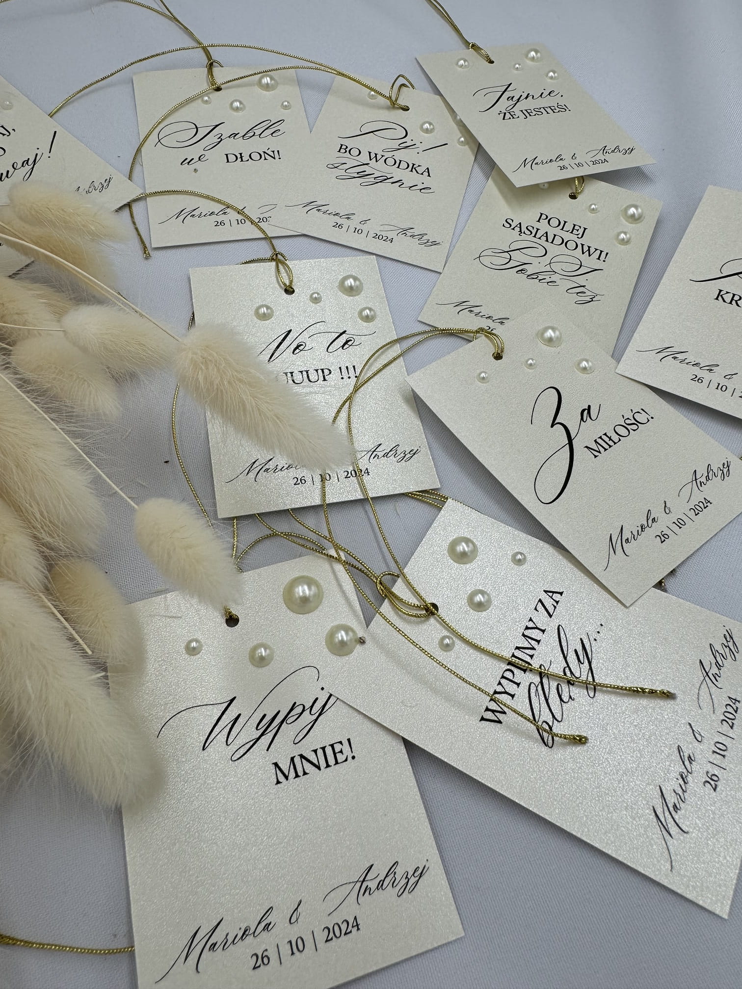 Zawieszki na alkohol weselny glamour – papier perłowy 250 g/m², złoty sznurek, perłowe zdobienia. Personalizowane tekstami, imionami i datą. Minimalne zamówienie: 20 sztuk. Realizacja: 10–14 dni, express 5–7 dni.