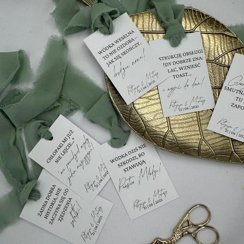 Personalizowane zawieszki na butelki weselne – biały papier 240 g/m², rozmiar 6,5 × 9,5 cm, imiona i data ślubu, 350 cytatów do wyboru, wstążka w zestawie. Minimalne zamówienie: 20 sztuk. Realizacja 10–14 dni, express 5–7 dni. Projekt wysyłany do akceptacji.
