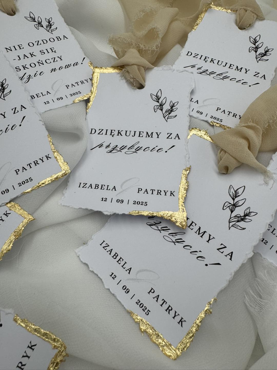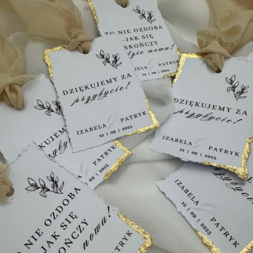 Połączenie białego papieru wysokiej jakości i eleganckiego złocenia sprawia, że zawieszki emanują ponadczasową elegancją. To drobiazg, który buduje spójny klimat wesela.