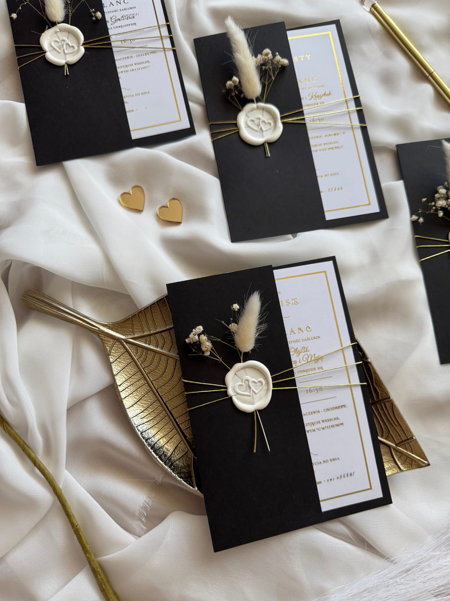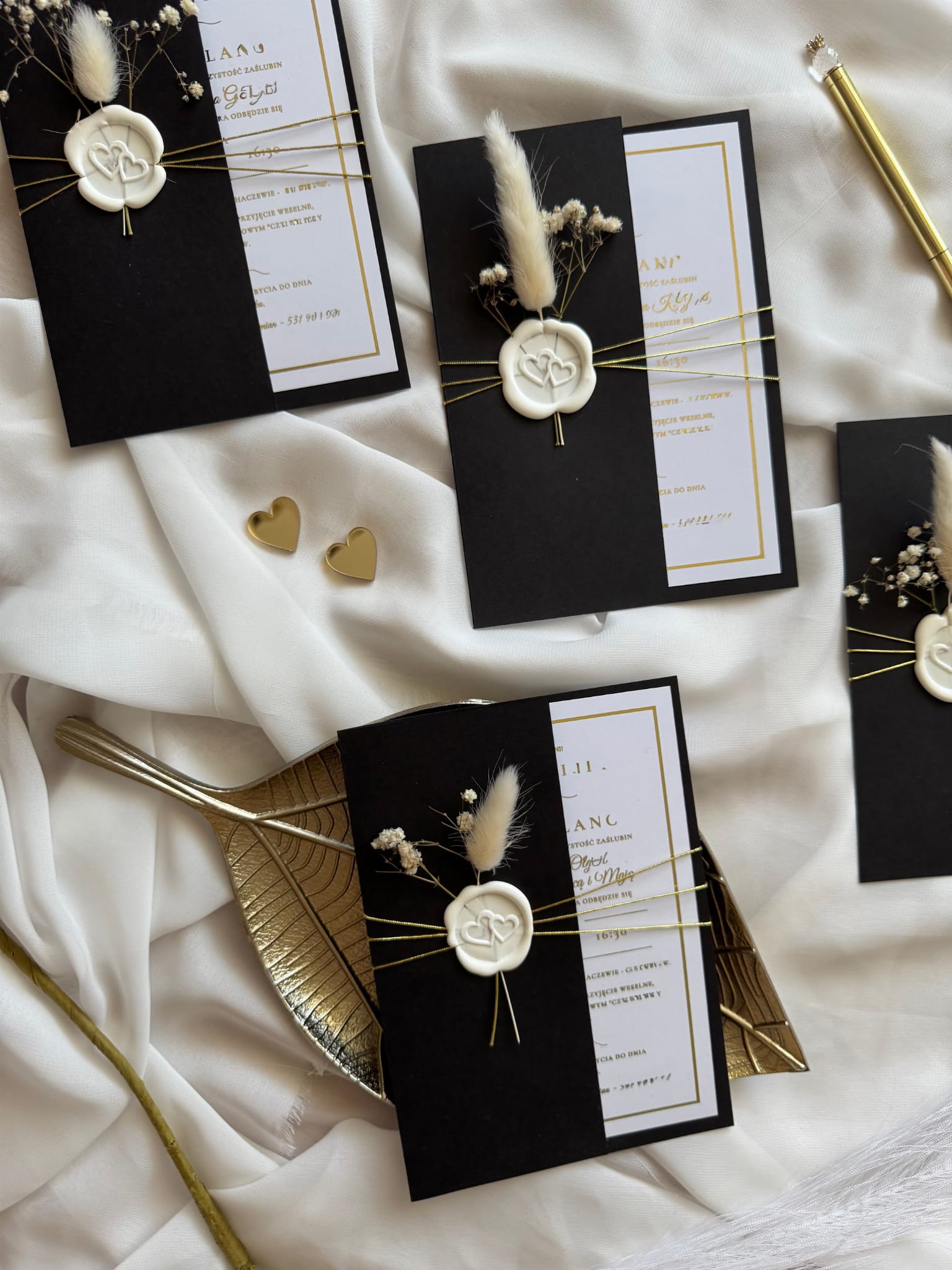 Całość ozdobiona została białą pieczęcią lakową ze wzorem serc, złotym sznurkiem oraz suszoną roślinnością. Te ręcznie dobierane elementy dodają zaproszeniu romantycznego charakteru i wyjątkowego stylu. Każde zaproszenie jest starannie składane i dekorowane z dbałością o każdy szczegół.