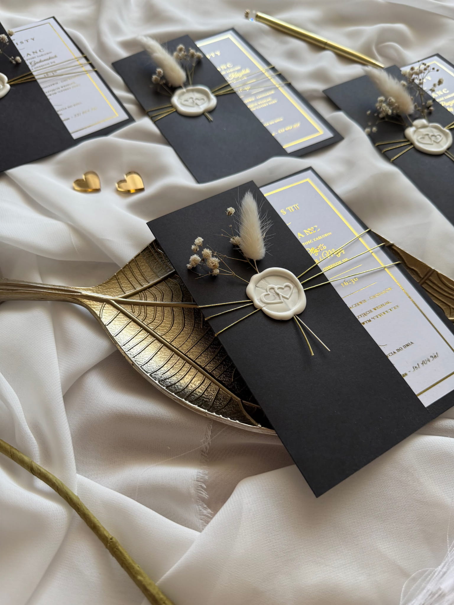 Zaproszenie „Amour” wykonane jest z czarnego papieru premium 280 g/m² oraz wewnętrznej białej karty 220 g/m², na której umieszczono treść zaproszenia. Złoty nadruk błyszczy w świetle, podkreślając elegancję i nowoczesny charakter całości. Połączenie czerni, bieli i złota tworzy luksusowy, ponadczasowy efekt.