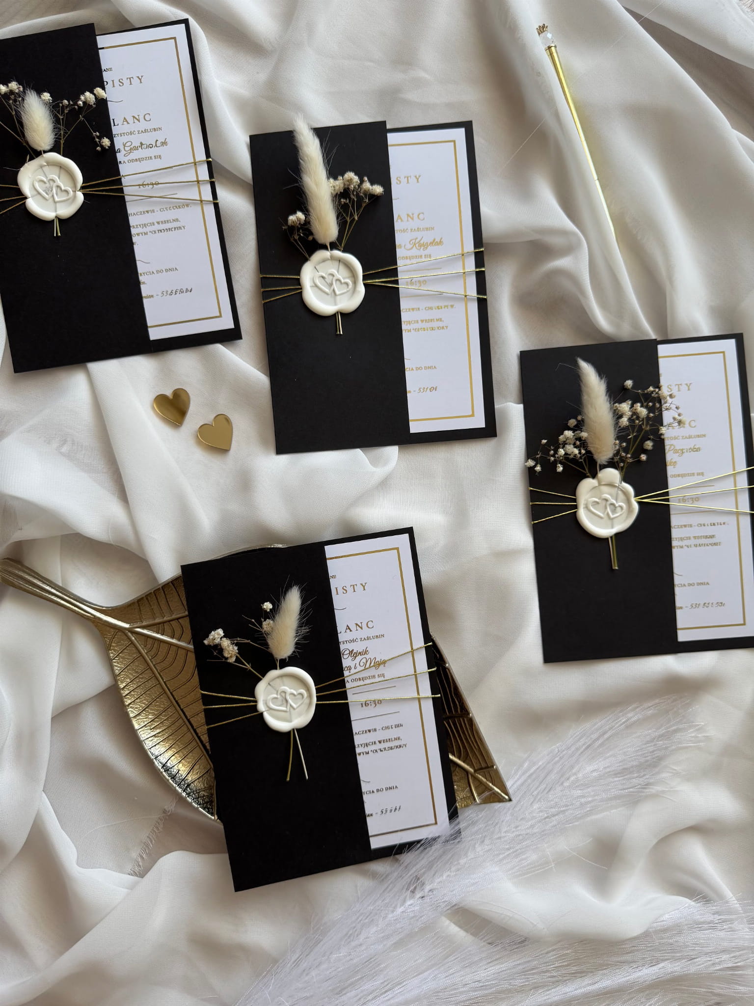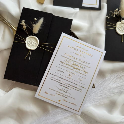 Zaproszenie ślubne „Amour” to kwintesencja elegancji i romantyzmu. Czarne folderowe zaproszenie z białą kartą i złotymi detalami zachwyca wyrafinowanym stylem, w którym luksus spotyka się z nowoczesnością. Subtelne suszki, złoty sznurek i biała pieczęć lakowa tworzą wyjątkową kompozycję z charakterem.