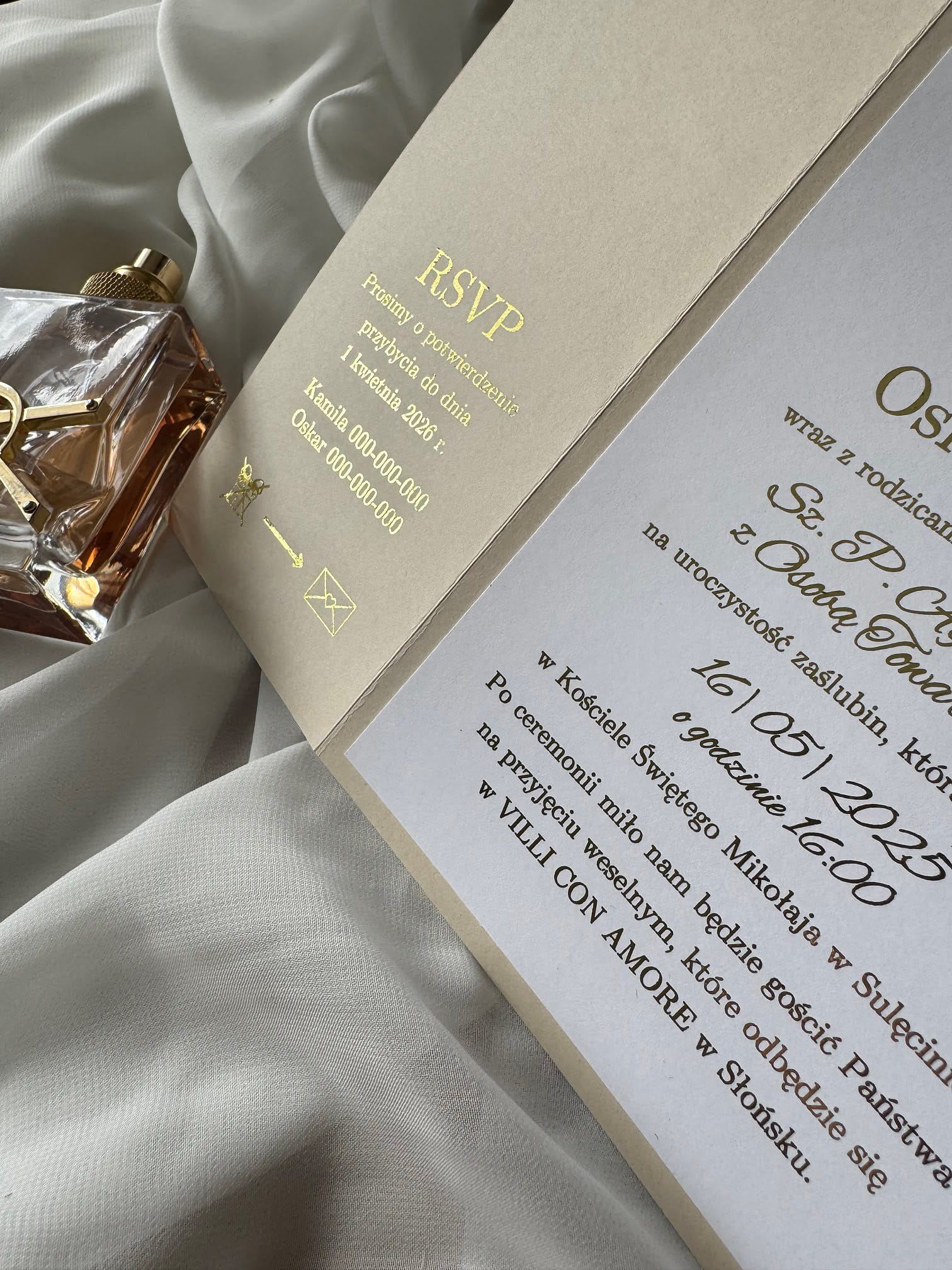 - Papier zaproszenia: beżowy 210 g/m² + biały 250 g/m²