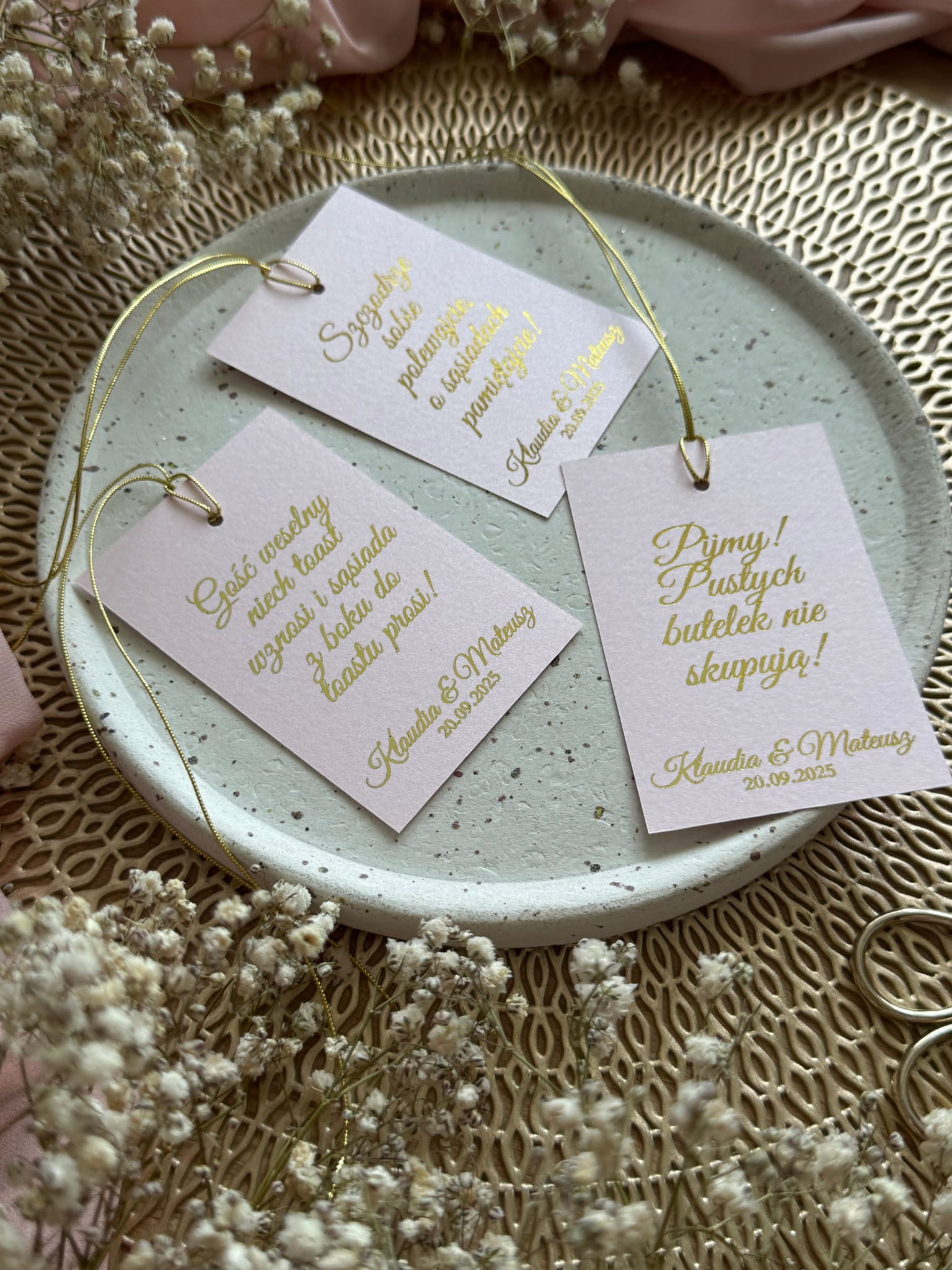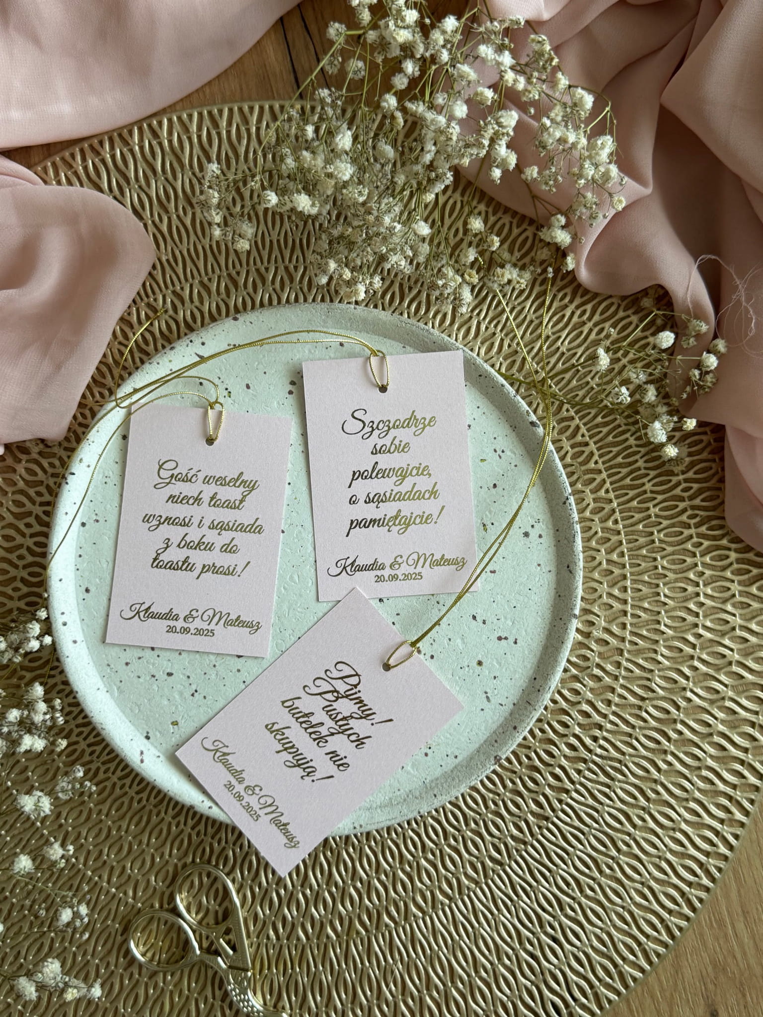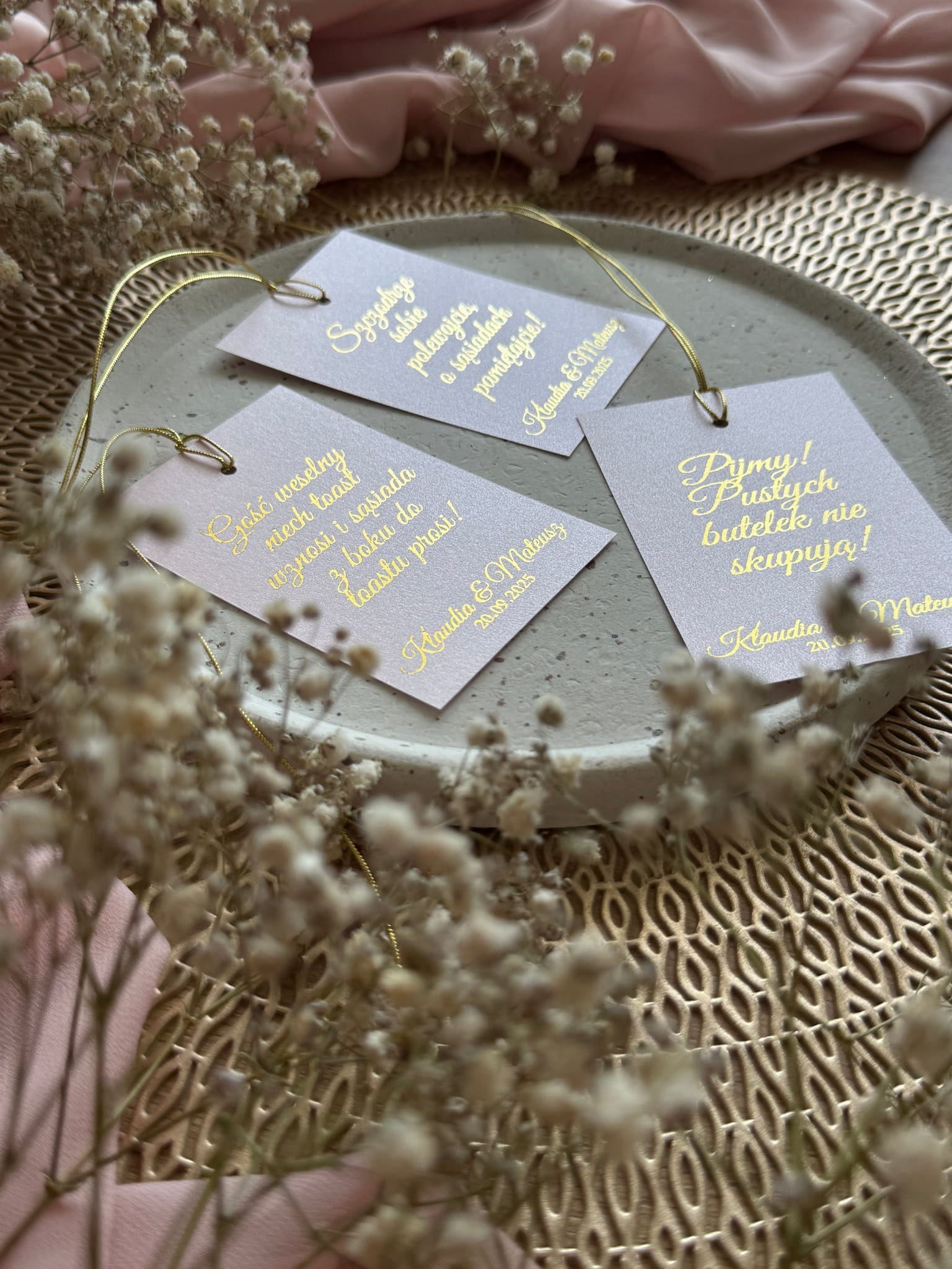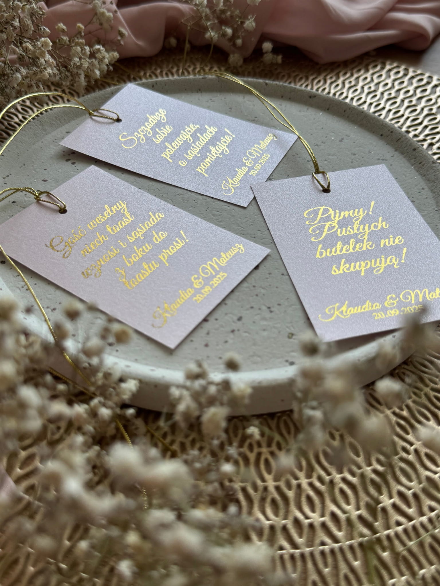 Stylowe zawieszki weselne wykonane z różowego papieru z delikatnym połyskiem oraz przewleczone złotym sznurkiem idealnie pasują do butelek wódki, wina czy prosecco. To dodatek, który podkreśli charakter uroczystości i świetnie zaprezentuje się na zdjęciach.